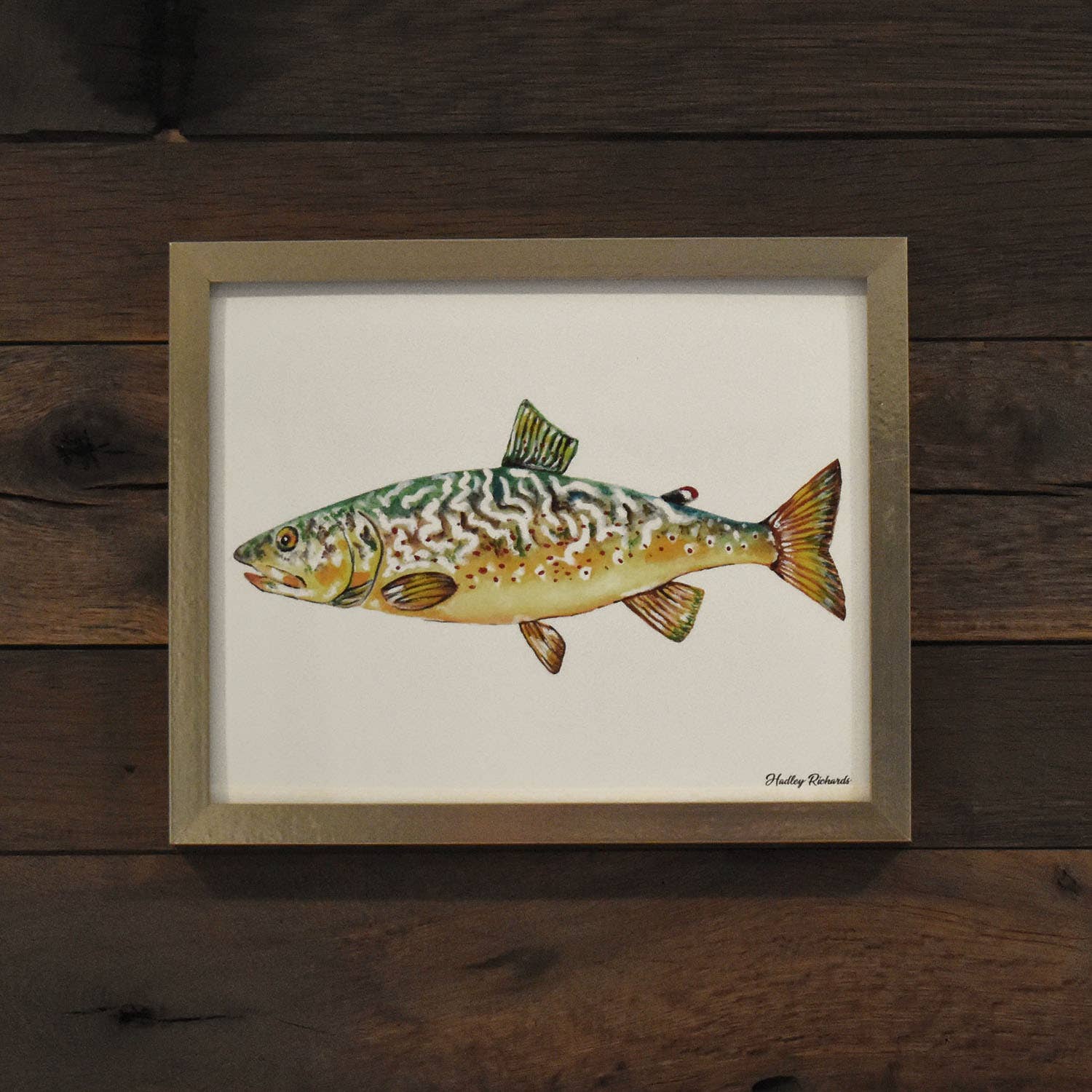 Dive into the serene beauty of nature with our art print featuring a stunning rainbow trout gracefully swimming in shallow waters, painted with bright and vivid colors that bring the fish to life. The different shades of blues used for the water create a sense of depth and movement, enhancing the realism of the scene. Showcase this masterpiece in your living room, to infuse your space with a sense of aquatic charm and artistic allure. • Printed with high resolution giclee inks • Fine art canvas mounted on wood • Solid hardwood frame in shown stain colors • Sustainable American alder wood • Made in the USA in our Utah studio • 12x18" x 1.5" deep w/ 3/4" thick frame • 18x24" x 1.5" deep w/ 3/4" thick frame • 20x30" x 1.5" deep w/ 3/4" thick frame • 24x36" x 1.5" deep w/ 3/4" thick frame • Signs may have +/-1" variations • Signs can stand on a shelf or table or can hang on the wall from the back edge of the frame • Farmhouse style frames have rustic imperfections that make them unique