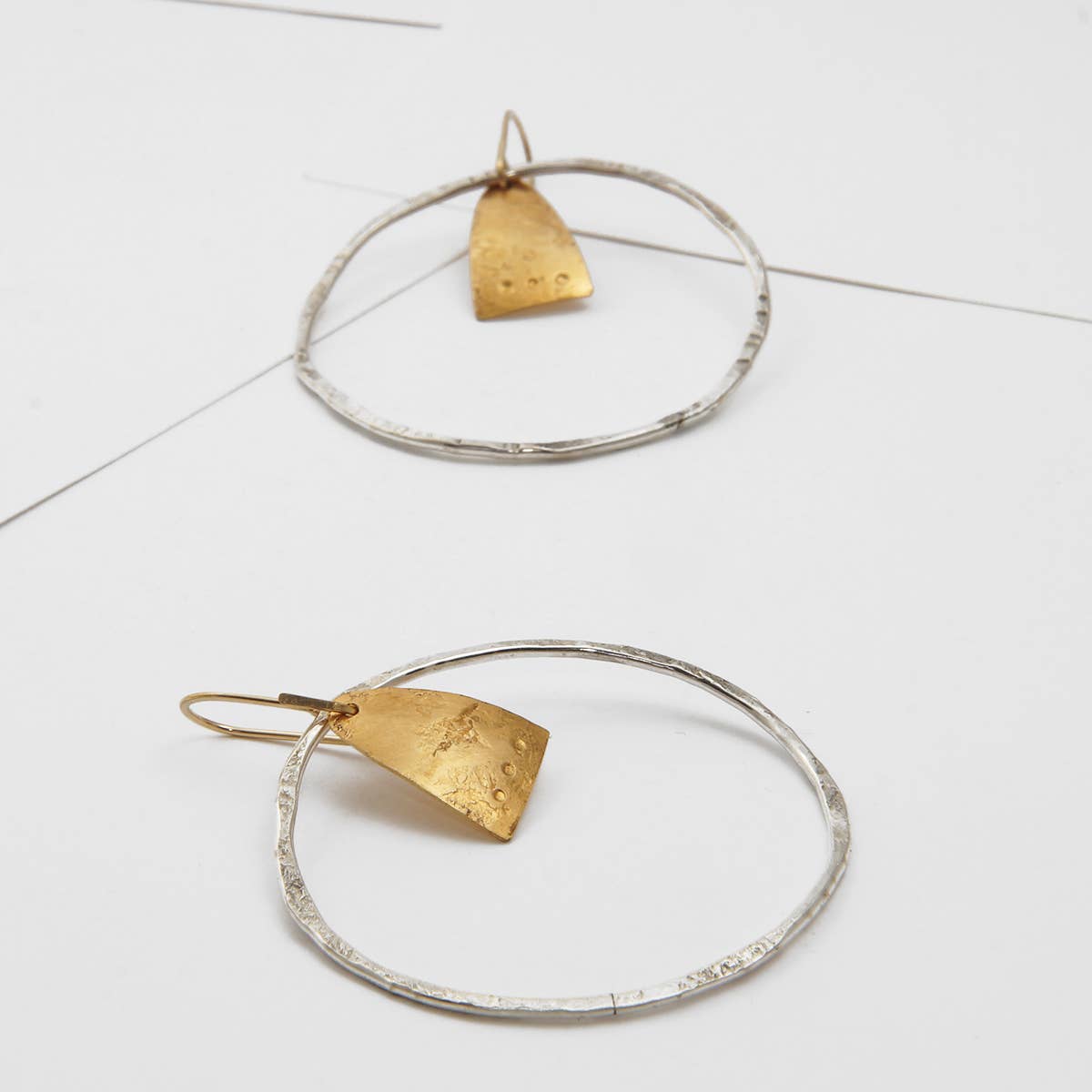 Arched arrows with mixed metal accents. Sterling silver with brass on sterling ear-hooks. 4" from top of hook.