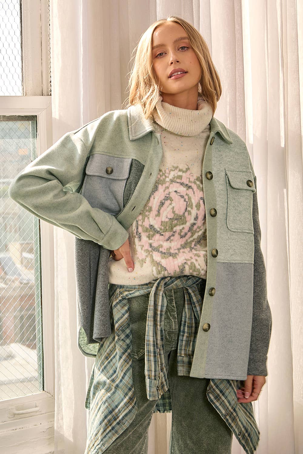 Contrast Sweater Sleeve Button Down Collared Shacket SALE