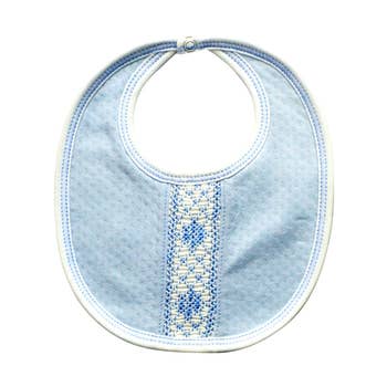 Infant Bib 100% Cotton 2-Ply Interlock Velkrow Closure Colors: White with Blue Binding Size: 12 1/4" long x 7 1/2" wide