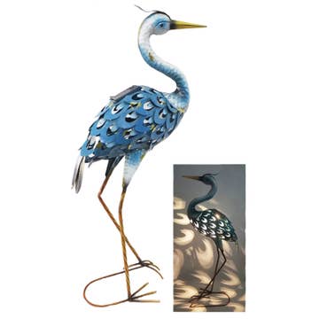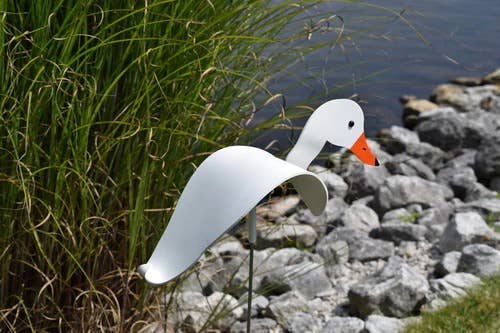 Our white naped crane dances on the slightest breeze. Our special hinge allows it to swivel and dip atop a 35" galvanized stake. It is 24" long x 6.5" wide. Made from uv-resistant pvc, entirely hand painted & hand formed, it is durable in day-to-day weather. Simply lift off the stake to take in during severe weather or extreme temperatures. Made in the USA.
