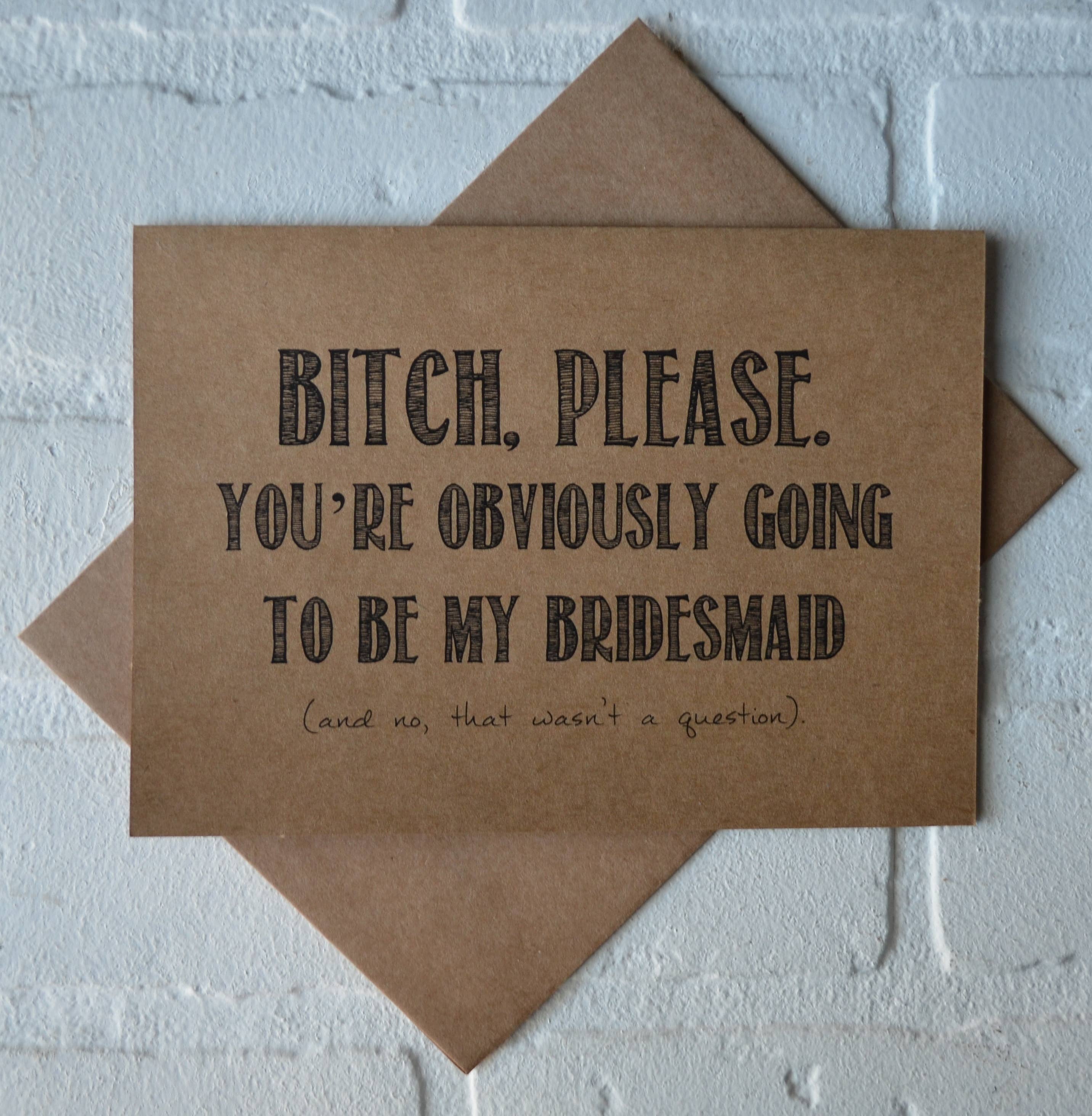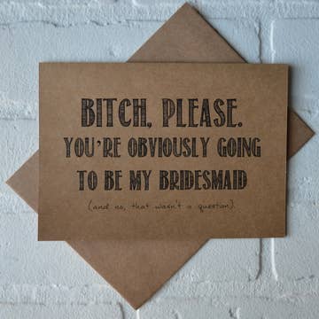 Funny Wedding card - You're obviously going to be my maid of honor/bridesmaid, etc 5.5 x 4.25 (a2) folded card. A2 100% recycled heavy kraft envelope. Professionally printed on 130# heavy cover stock. Heart shaped cut out on the front, revealing the gold heart sticker on the inside of the card.