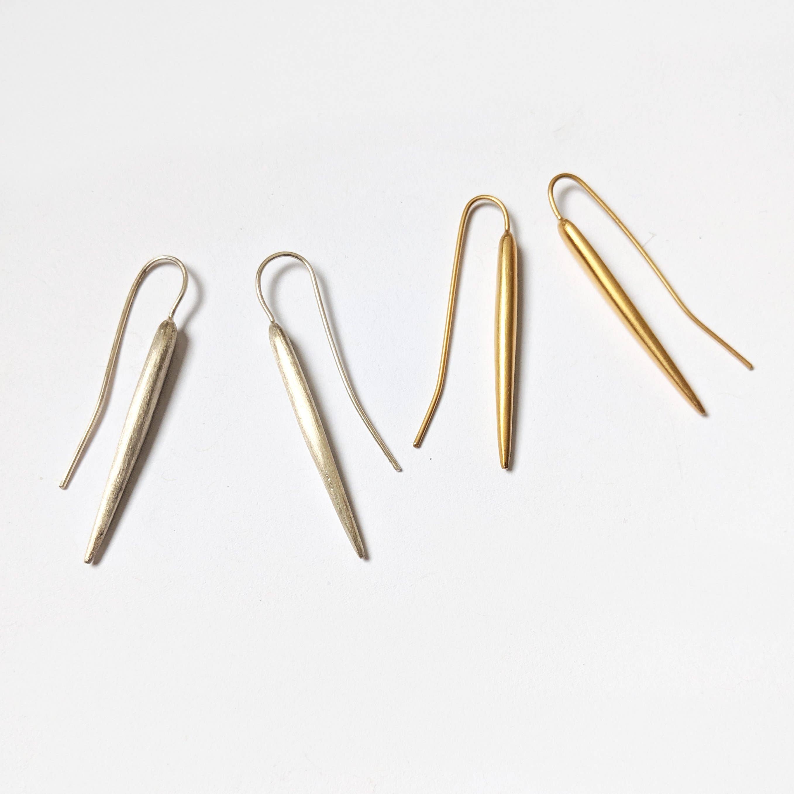 A matte gold metal is bent into a slight arc to create an interesting twist to a classic linear style. • Measures 2.75" long with nickel-free and lead-free French ear wires. • Crafted from a brass metal mix. It is nickel, lead, and cadmium-free. • Handcrafted by women artisans in India.