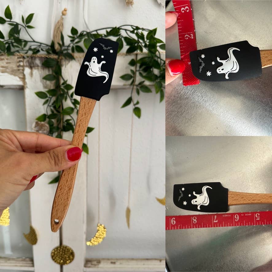 Spooky silicone mold that could be used for chocolates, ice, soaps, and lots of other crafts. packaged in a black organza bag and ties with a ghost miniature spatula. perfect gift set for your customers next holiday.