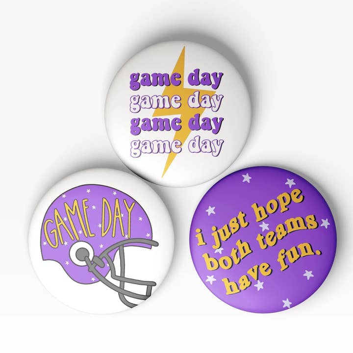 3 INCH PURPLE & GOLD GAME DAY TAILGATE PINBACK BUTTONS ★ PURPLE BACKGROUND ★ WHITE BACKGROUND ★ GOLD BACKGROUND