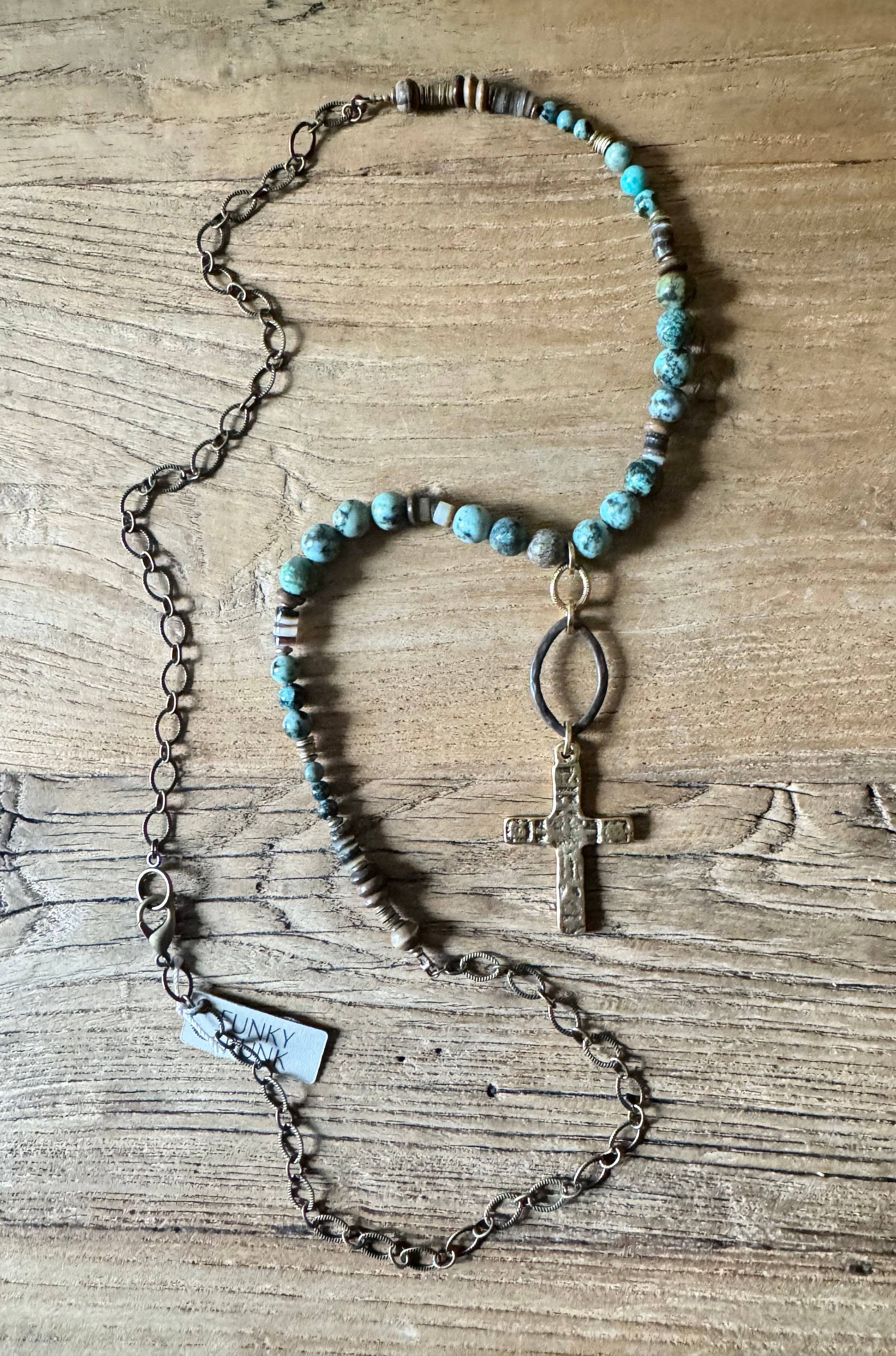 Cross Charm Toggle 30" length necklace This necklace has trinkets and charms and a boho vibe. This mixed metal consists silver, antique bronze, picture jasper beaded chain, amber crystal, large cross, silver stamped cross and a larger buffalo nickel. It also has a bronze toggle closure. Pairs with: Double Crystal Earring Filigree Teardrop Rhinstone Earring