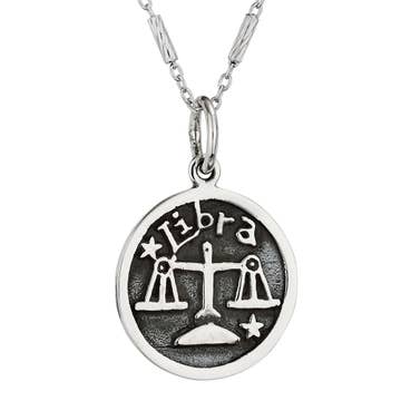 LIBRA SYMBOL OF SCALES kind and intelligent, values harmony in all forms. Ruled by Venus, the planet of beauty, Libra adores a life that looks good. Delicate and stylish, this necklace complements jeans, business attire, and your little black cocktail dress. MORE ABOUT THE COLLECTION The nickel-free zodiac necklaces feature an adjustable 16-18" cable necklace with a free-floating disc charm depicting your sign's constellation. Necklace is 14k gold dipped and fitted with crystal accent stones as stars.