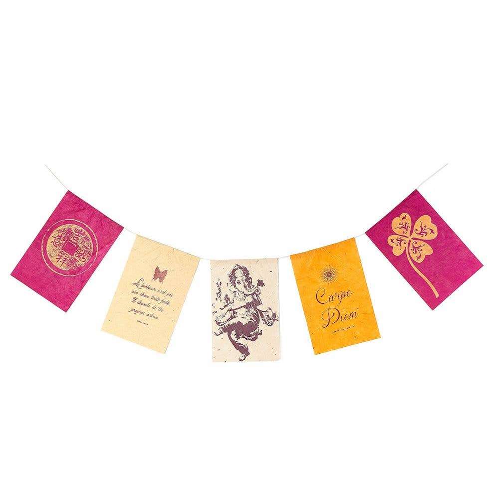This mandala inspired bunting is too pretty to use at special occasions only. It's a perfect accessory to decorate your meditation space or simply hang in your home or garden. When used outdoors the fabric will fade and deteriorate, just like the Tibetan Prayer Flags. Strung on sturdy cord and made of fine cotton each flag is decorated by hand with a block print. The bunting is a fair trade product hand made by Nepali Women. Contents: 7 Flags of 15 x 15 cm hanging from a cord with a total length of 2 m.