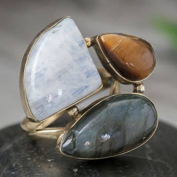 Inspired by a the hues and textures of the ocean; Aquamarine are embedded in brass to create this statement ring. Length 3/4" Width 1/2" This piece is handmade-to-order. Each piece will vary slightly due to the uniqueness of the stones. All metal is nickel free. Material: brass, metal, semi-precious, stone, gemstone, recycled.