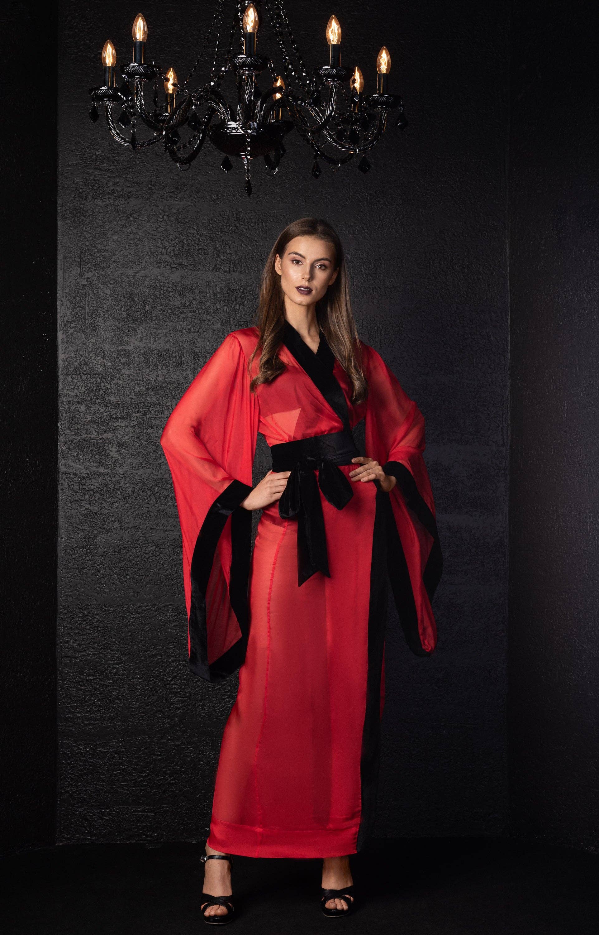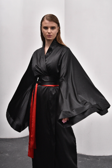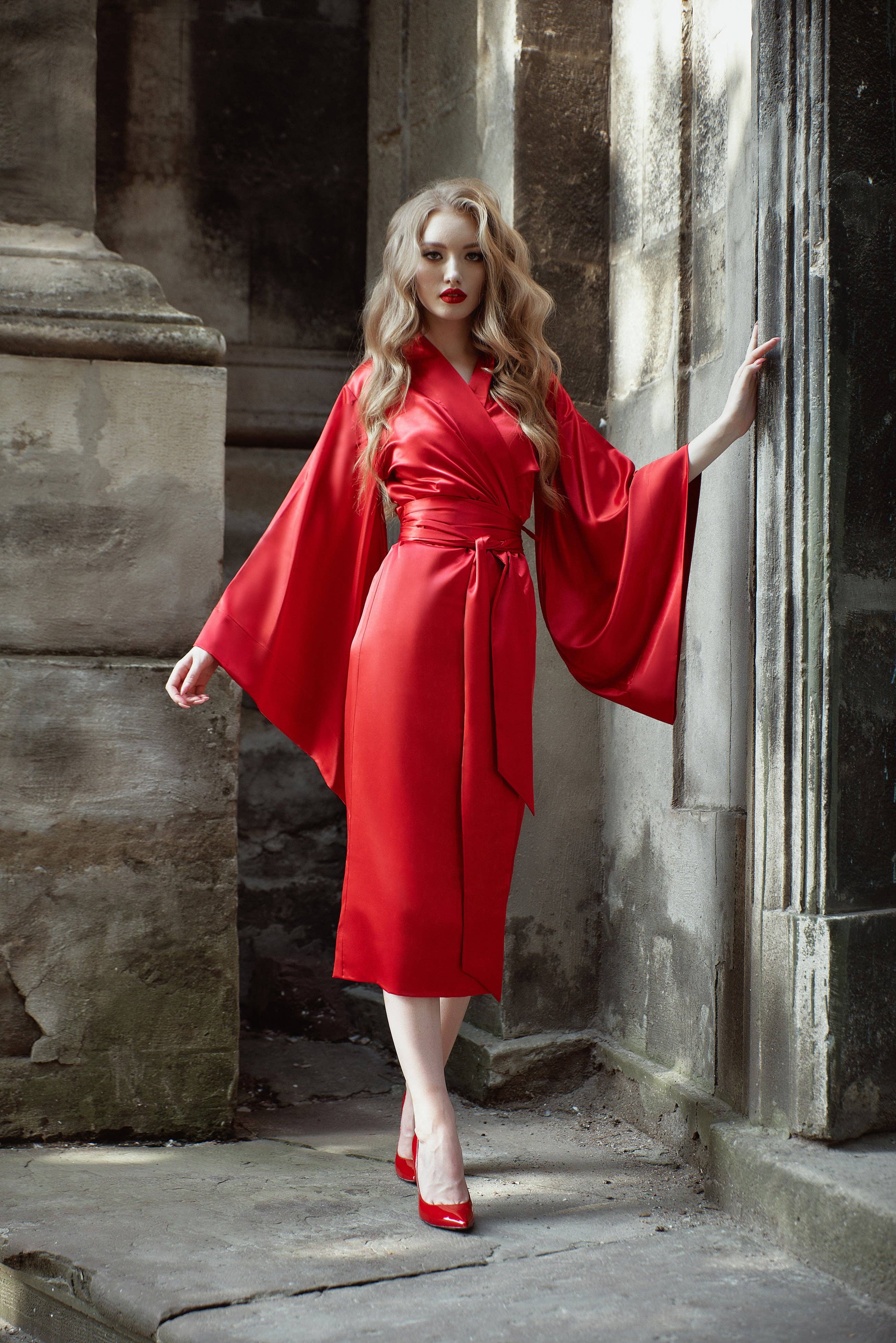Ankle/floor-length, wrap-over style, with two sets of inside ties. Obi belt included- 10cm wide, 2.7m long. The obi tie wraps over the waist twice and is tied in the front, or side. Robe length - 147 cm/58 inches. Material Composition:  polyamide 60%, viscose 20%, polyester 10%, silk 7%, elastane 3% XS/S Bust 80 cm - 90 cm/29''- 31'' Waist 60cm - 70cm/22''- 23'' Hips 85cm - 95cm/32''- 34'' M/L Bust 87cm - 95cm/34''- 37'' Waist 67cm - 73cm/26''- 29'' Hips 95cm- 105cm/37''- 41'' XL/2XL Bust 108cm- 118cm/43''- 46' Waist 88cm- 98cm/35''- 39'' Hips 117cm- 125cm/46''- 49''