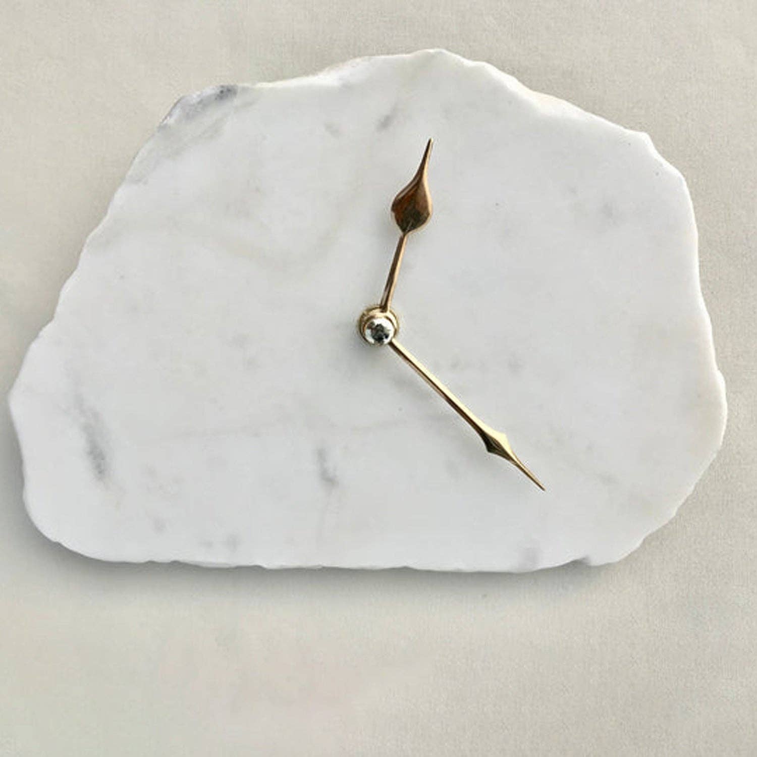 FEATURES irregular shaped agate quartz slab, thick and substantial the edges of each piece are electroplated (not gold leaf or gilded, which may rub off) with beautiful thick metallic GOLD has a sturdy hook at the back to hang on the wall can be mounted on metallic gold brass plated metal base which is provided free of cost brass finish modern style hour, minute hands quartz mechanism included, battery powered double AA battery not included 6" x 7" (approx) simple yet elegant design, makes a great gift! Can do Gold, Silver and Copper edgings with matching hands Each piece is unique and there will be slight variations in shape and colour