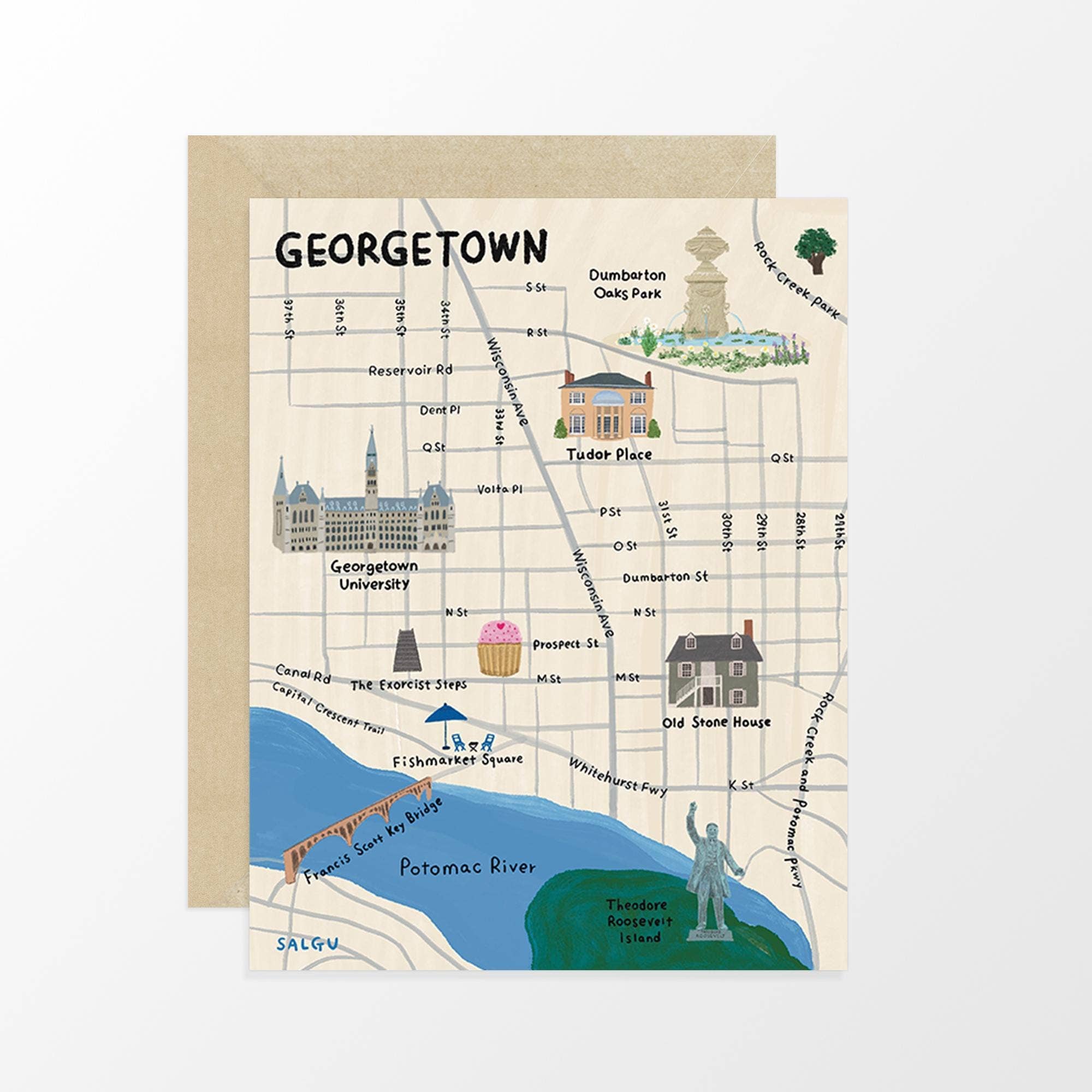 Meet the Georgetown, DC Neighborhood Map greeting card! Our greeting cards are 5x7” so they can be mailed or easily framed as a mini-print. Each greeting card is packaged in a crystal clear poly sleeve with a kraft paper envelope. This hand-illustrated map includes all the streets in the neighborhood, as well as local parks in a vibrant green. We’re excited to help you celebrate all the places you call home with this colorful map greeting card! As part of our commitment to the planet, our maps are printed in EcoSilk paper using soy-based inks for minimal environmental impact. Our maps are locally printed in Washington, DC with vibrant, saturated colors, and high quality papers and inks to make sure the colors won’t fade over time.