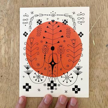 Individually hand-printed 5 x 7 inch greeting card, black ink on ivory cardstock with matching ivory envelope. Image is based on a hand-carved woodcut print by David Morgan, printmaker in Bath, Maine, USA. Each card is printed one at a time by the artist on an etching press. Minimum order is 25 cards, which can be all one design or mix-and-match in any combination.