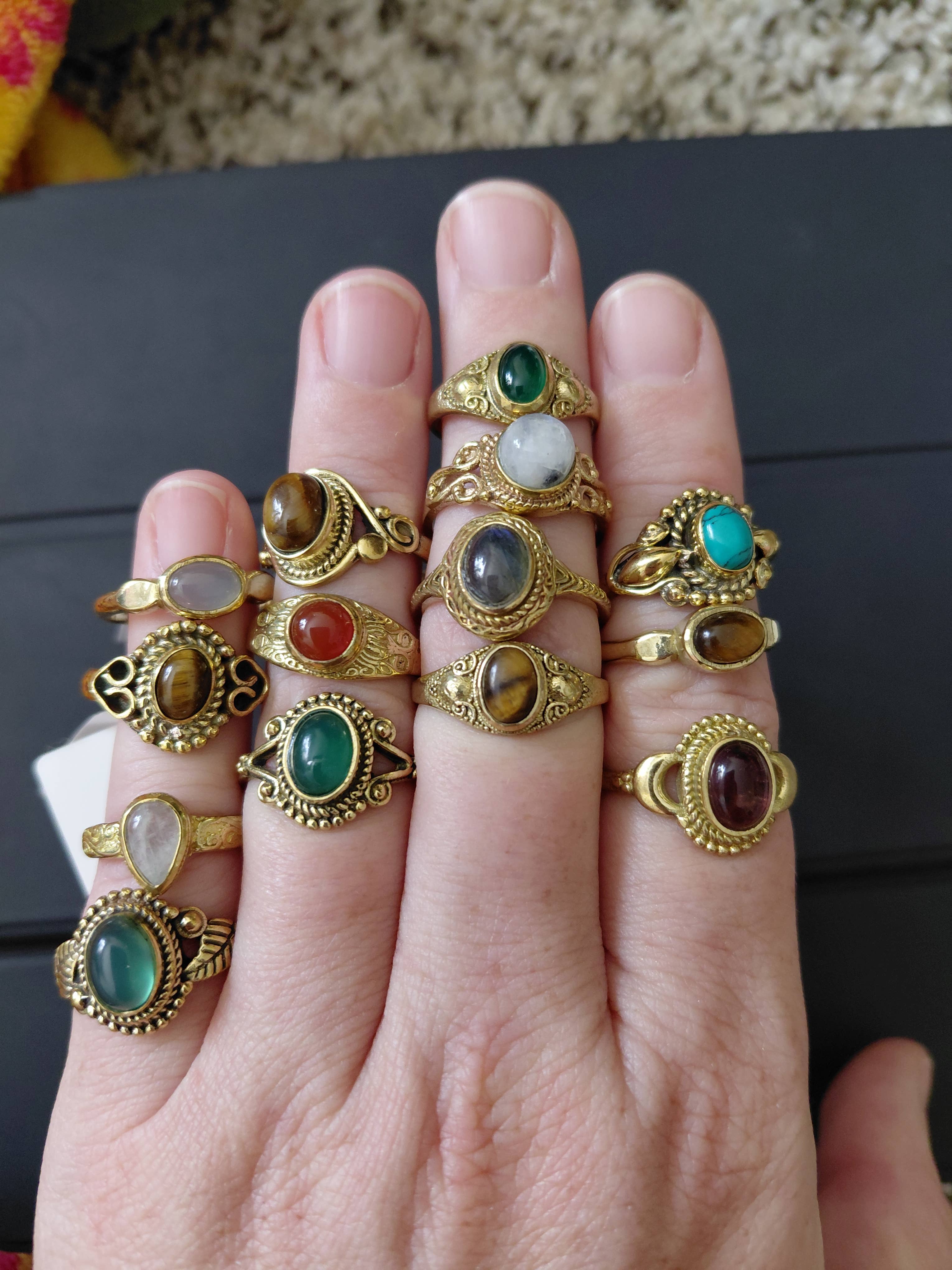 Enhance your retail collection with our exquisite natural gemstone rings, crafted in high-quality brass and made in India. These rings come in assorted styles, each featuring a unique and handmade design that appeals to discerning customers seeking one-of-a-kind jewelry pieces. By offering these artisanal rings, you'll attract a clientele that values craftsmanship and individuality, boosting your shop's appeal and increasing sales. Add these elegant and distinctive rings to your inventory to elevate your product offerings and captivate your customers. If you have specific style or stone preferences, you can request them after placing your order.