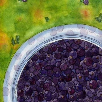 Single color, Violet pear Riso print. A jumble of vining grapes and leaves fill the page in a sea of soft violet. Riso print on white 65lb cardstock. Packaged individually in poly bags with white backing board. Illustration by Valerie Burgess 11"x8.5"