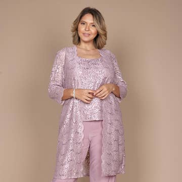 You're sure to shine in this lovely women's formal pantsuit that features a sleeveless sequined tank top that matches the shoulders and 3/4 sheer sleeve cuffs of the knee-length duster, and pull-up, elastic-waist, wide leg pants that is perfect for mother of the brides or grooms, wedding guests, dinner parties, and holiday celebrations. Additional Details: - Lined - Pullover Construction - Care: Spot Clean or Hand Wash Cold Sequined Stretch Mesh (94% Polyester, 6% Spandex) Lining (100% Polyester) Style: 2756