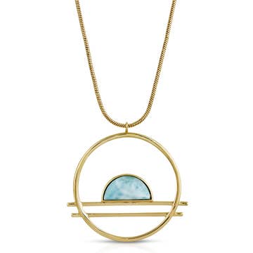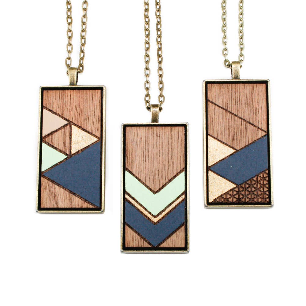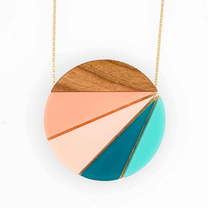 Like rays from the sun, these mixed-material one-of-a-kind pendants are sure to brighten up your day. Metallic rays shimmer between amidst hand-pieced acrylic which is sanded smooth, with a matte finish resembling stone. Finished with a walnut or cherry wood top. Pendant measures 1"W x 1.75"T on a 30-32" rolo chain in gold-fill {g} or oxidized sterling silver {s}. Metal choice (notated as {s} or {g} ) is displayed with the color options below. Made of 65% upcycled acrylics + USA-sourced hardwoods. *please note: These are one-of-a-kind designs, so please contact us when ordering + we'll send you images with our current inventory so that you can choose your favorite/s.
