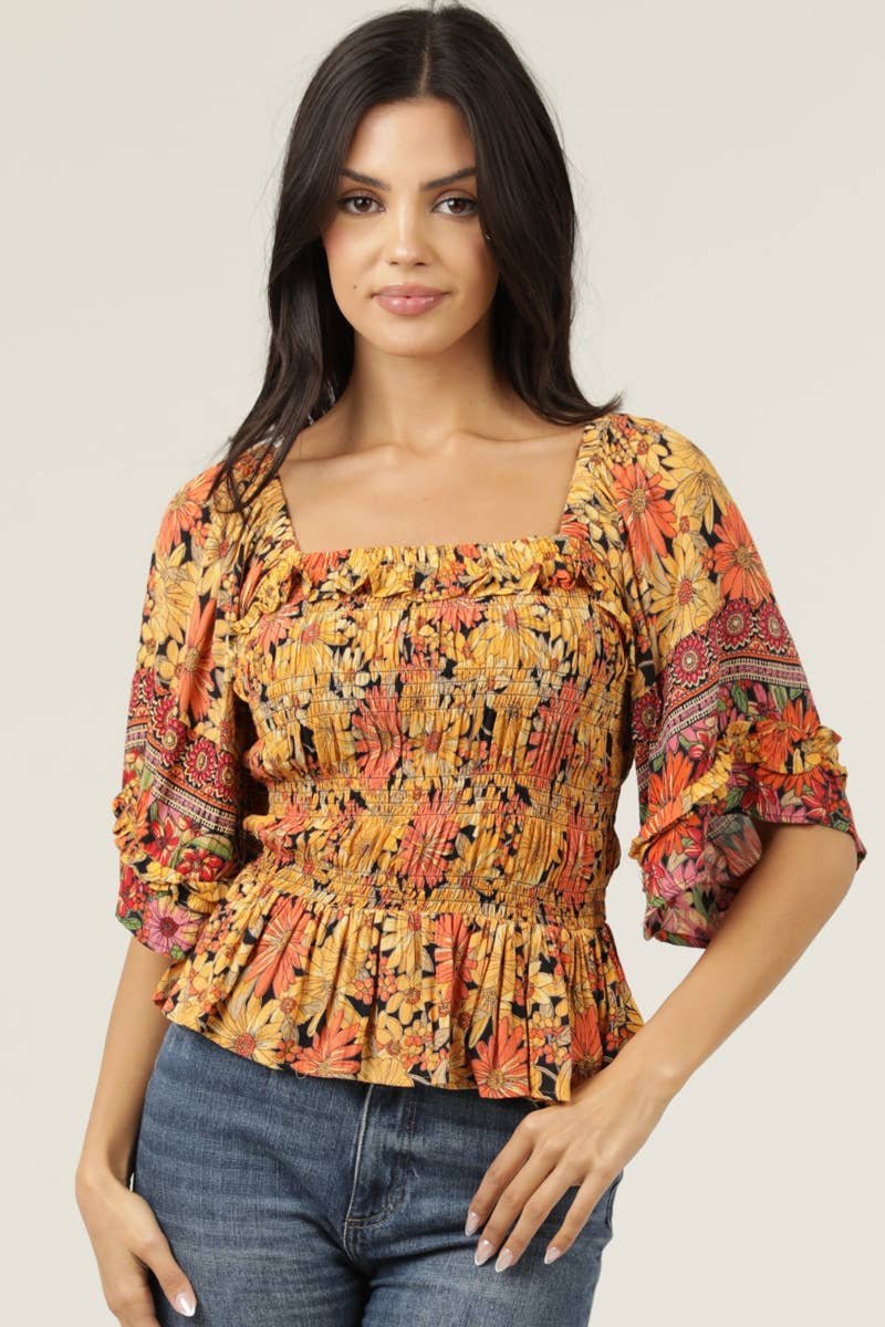 * Style No.: SB114462-2 Off Shoulder Smocked Top Off Shoulder Smocked Top Flirty off-shoulder design with an allover smocked bodice for a snug, flattering fit. A fun staple ideal for warm days, beach outings, or casual summer plans. Fabric: Woven 100% POLYESTER Hand Wash Cold Sizes in Pack:2S-2M-2L