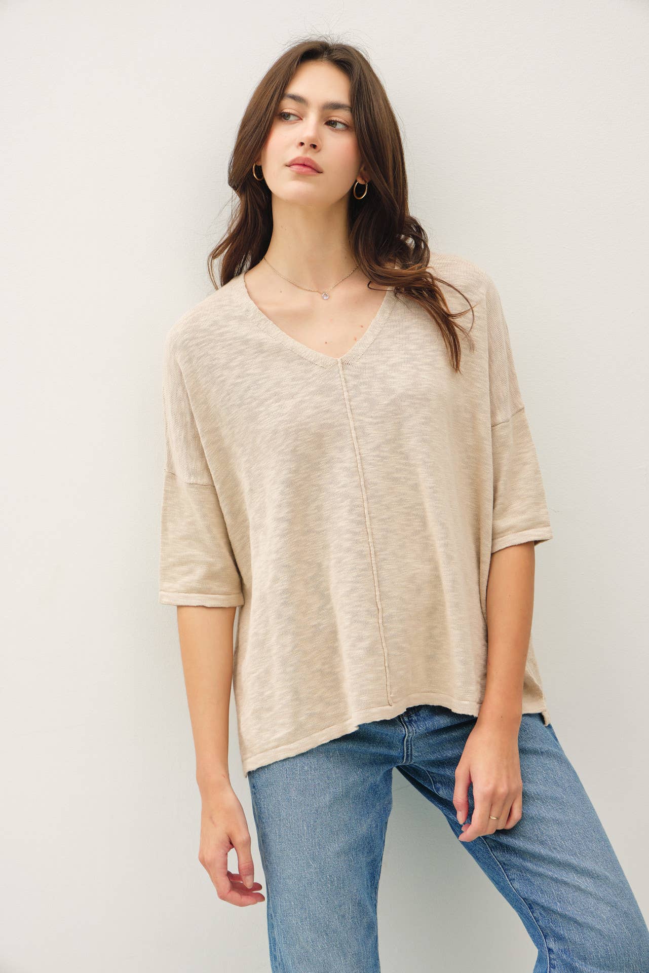 This stylish top features a deep V-neckline, a relaxed silhouette with side slits, and cuffed short sleeves, perfect for elevated warm-weather styling. Crafted from premium lightweight woven fabric, it offers a subtle textured finish that adds sophistication to any outfit. Features: • 100% Polyester • S-L: 2-2-2 • Deep V-neckline for a flattering look • Relaxed fit silhouette with side slits for ease • Cuffed short sleeve design for added style • Premium lightweight woven construction for breathability