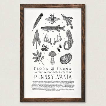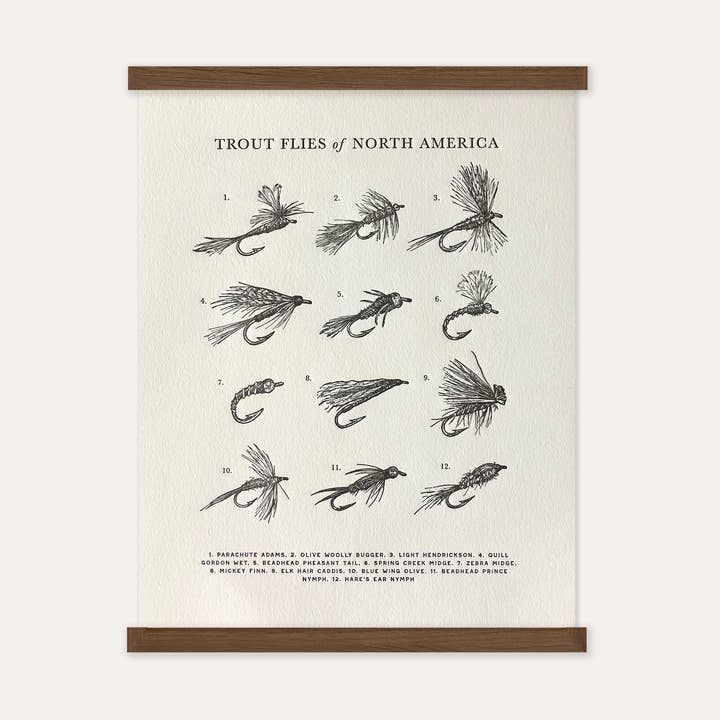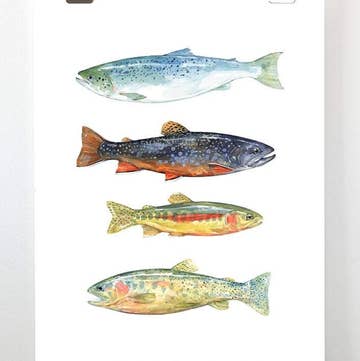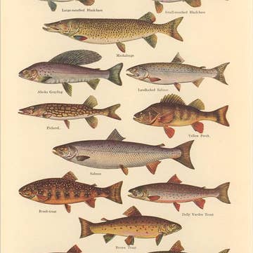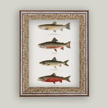 A hand-illustrated guide to freshwater game fish including bluegill, rainbow trout and American shad. DETAILS - Letterpress printed on high quality cotton paper - 11x14 ready to frame size (frame not included) - Packaged for retail in branded cello sleeve and chipboard backer