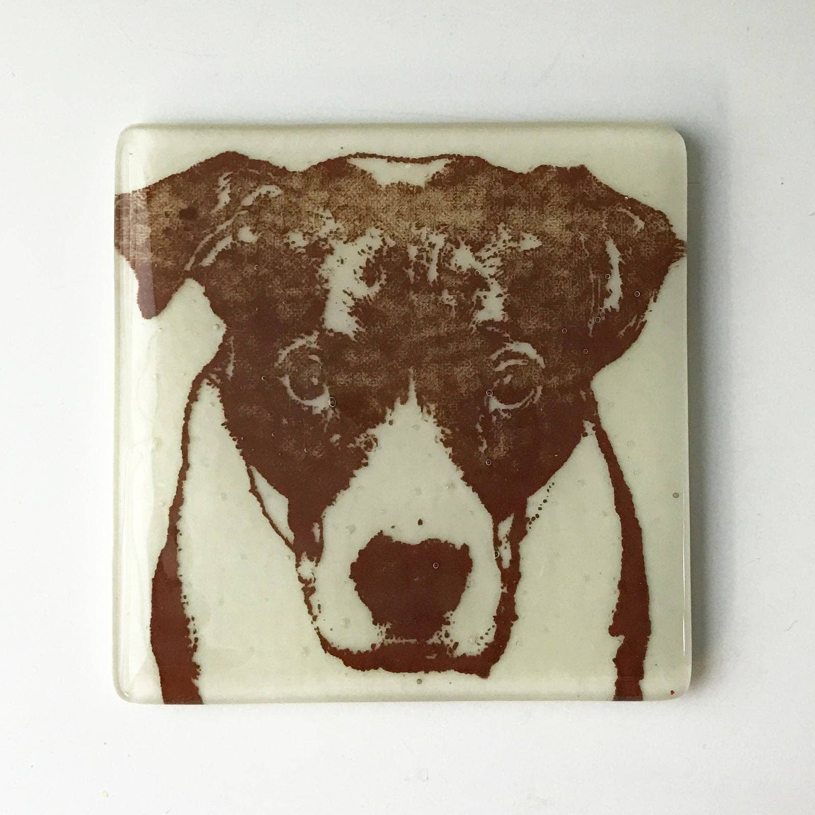 This coaster features our bully dog (Ruby) design. Multi-functional little art pieces make great gifts, and are a great size (and price) for buyers. This design is perfect for dog lovers everywhere. * Ivory glass, printed in brown enamel * 4" square, with rubber bumpons on bottom * Dishwasher safe * Handmade in the USA Coasters are screen printed, fused glass. Glass is cut, and screen printed by hand with fine glass enamels, then fused overnight to 1415 degrees in a kiln. Each piece is made by artist Laurie Freivogel in her Oak Park studio. This design is part of a series and has other matching housewares!