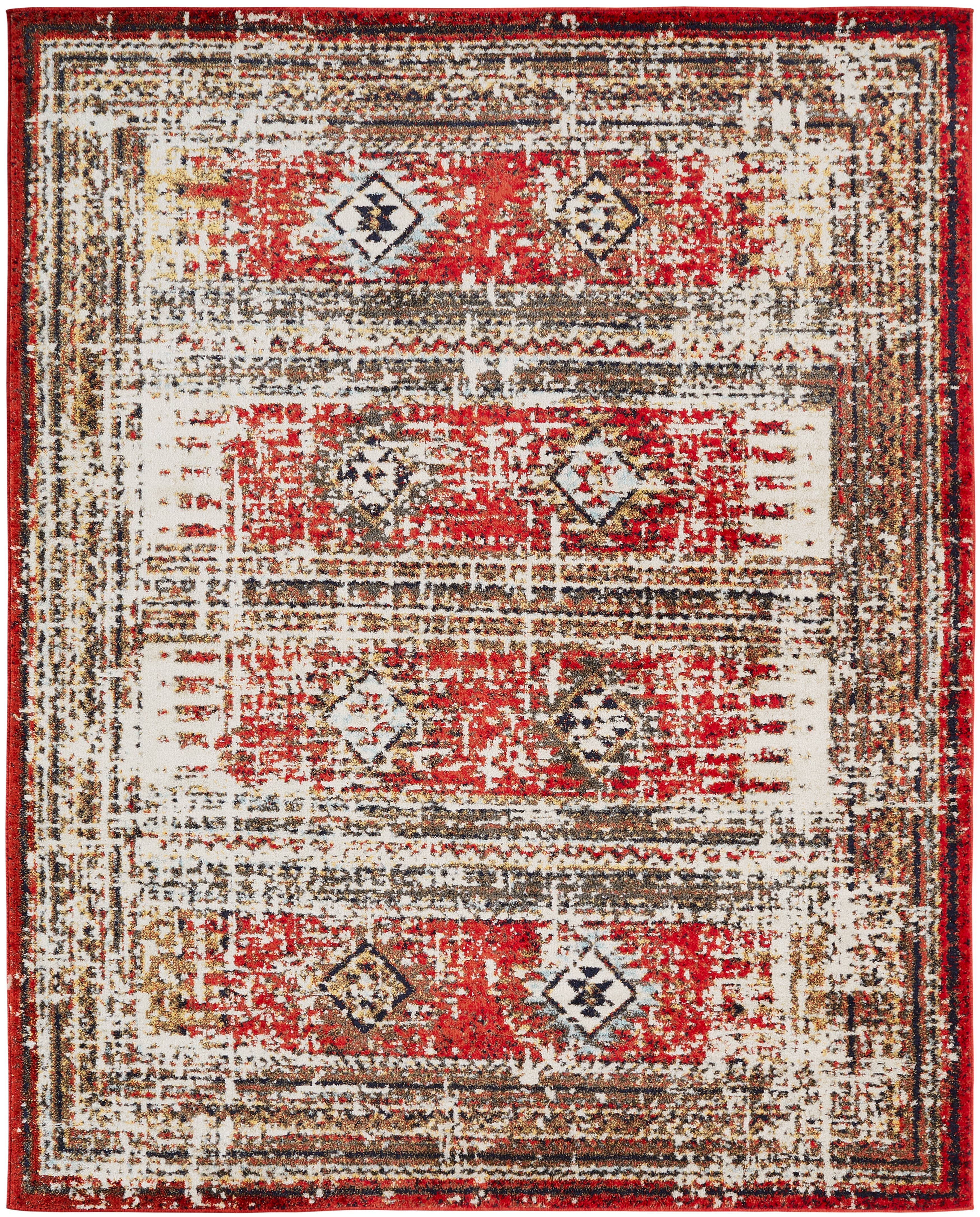 Praha Vintage Global Tribal Flat-Weave Rug. Timeless patterns inspired by traditional Serapi rugs of Persia. Vintage-style colors create the look of a well-loved heirloom. Recycled fiber backing is safe for all types of floors. Stain-resistant, shed-free & durable. A flat pile fits under doors easily. Machine washable for quick, easy cleaning. The use of a rug pad is recommended to add comfort and prevent shifting. Inspired by traditional Persian Heriz rugs, the Apollo Serapi collection features elegant, geometric patterns with sophisticated designs and rich colors, plus timeless vintage styling that creates an appealing lived-in look. The versatile designs work well in rooms of all sizes, including casual and formal settings.