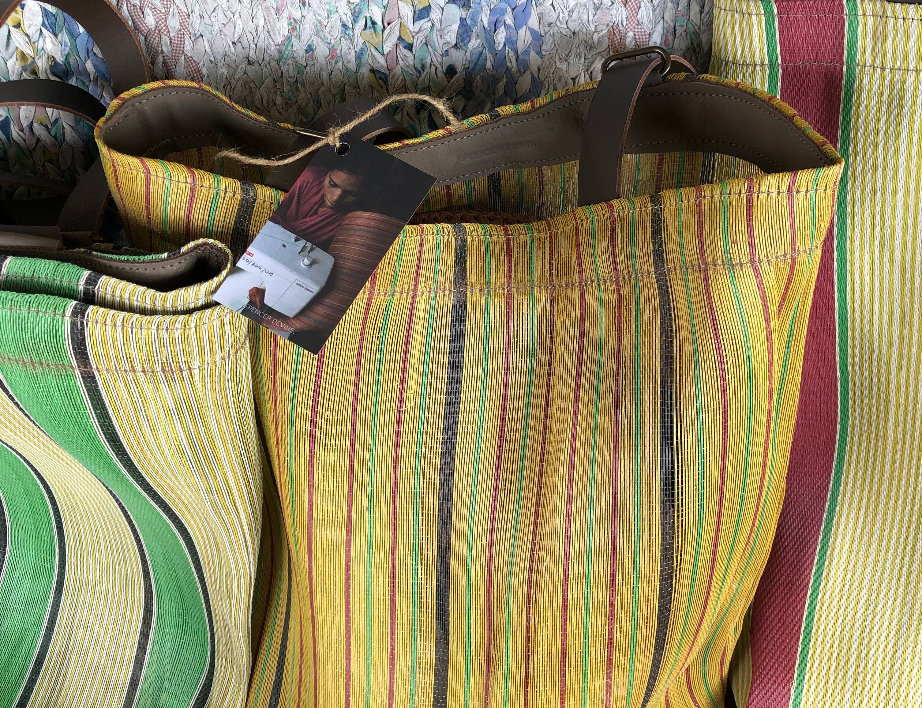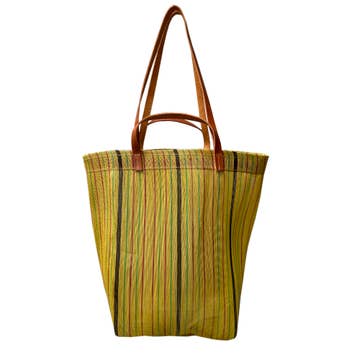 H:13.5", W:13". Recycled Plastic and Leather Each tote bag is meticulously stitched by artisans in Assam, India, under fair trade conditions, then finished with leather straps and detailing in Brooklyn, New York. Perfect for the market, beach, or everyday use, our tote bags not only support the livelihoods of our artisan partners but also help keep plastic out of landfills. It's a win all around.