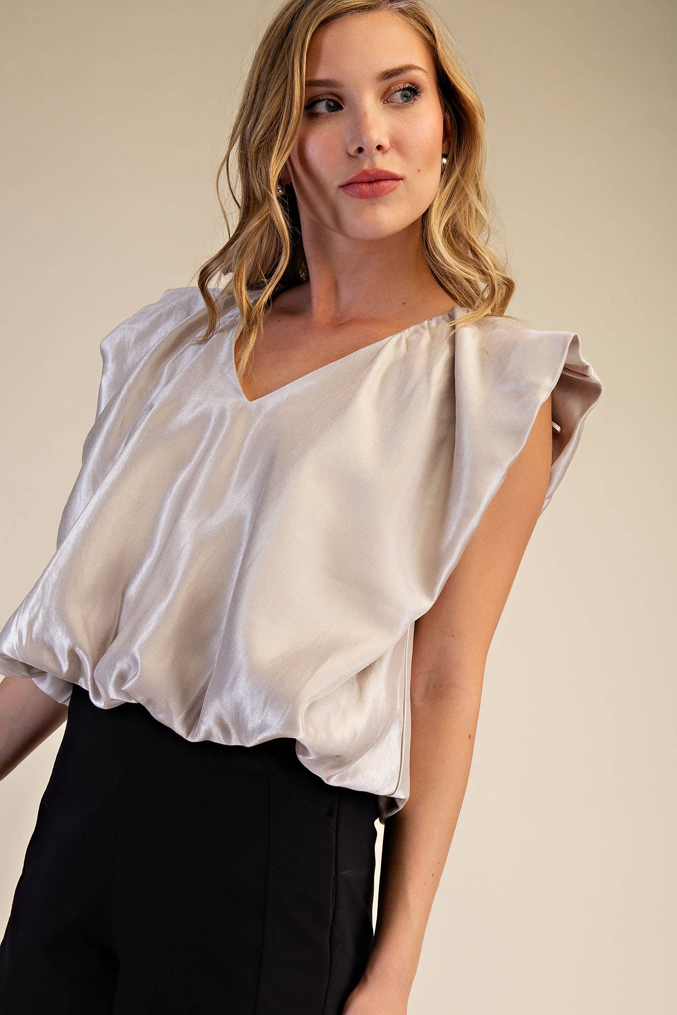 Wholesale Made in USA Satin Cowl Neck Short Sleeve Top with Scarf