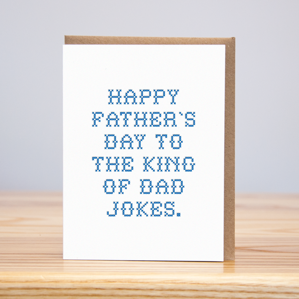 C'mon, dad jokes are great. Letterpress printed on recycled French paper. 5.5" x 4.25" Blank inside. Bagged in a biodegradable sleeve with kraft envelope.