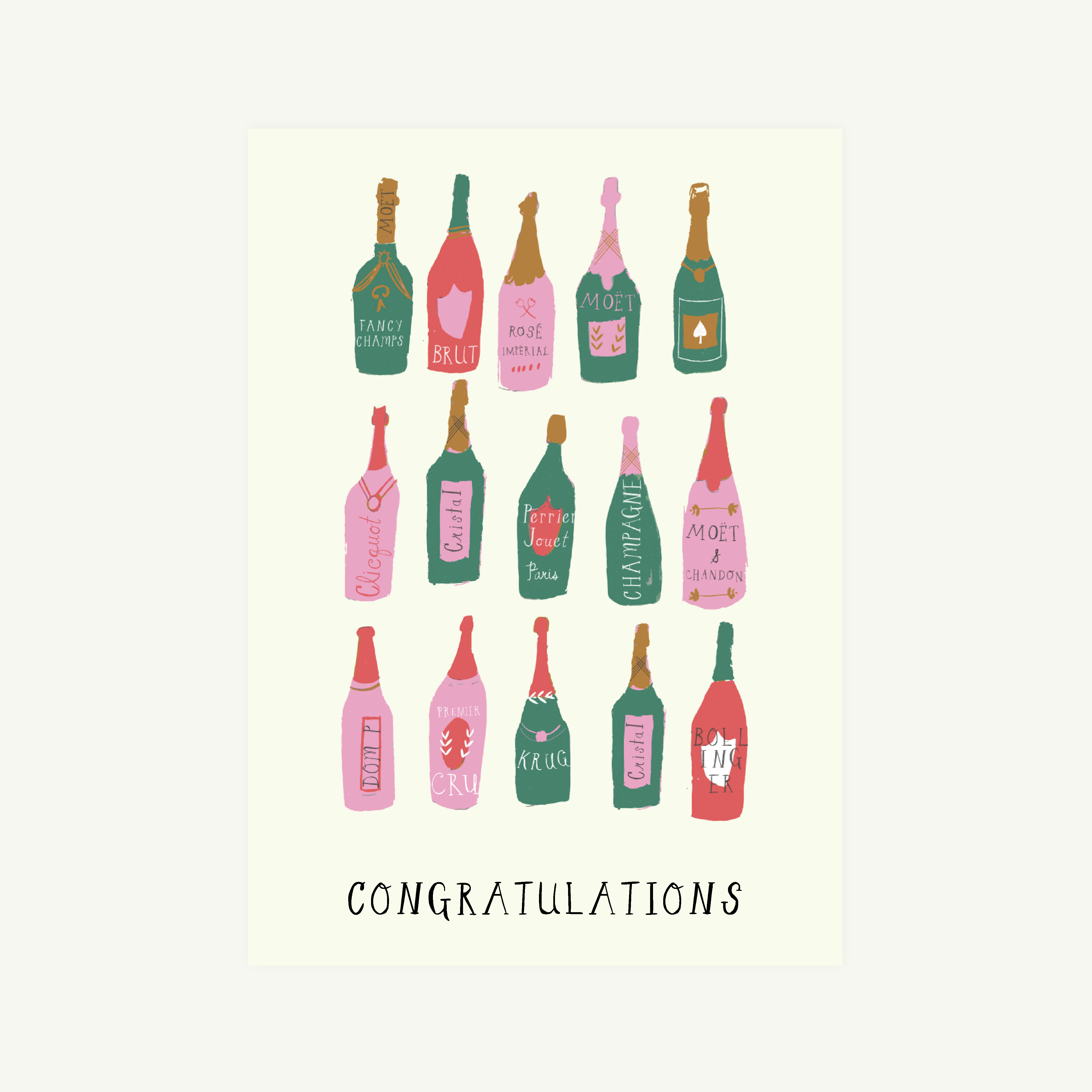Cheers to you! A coquette congratulations card. The bows are bowing. Size A2 card Printed on luxe 110# felt stock White envelope Packed in clear sleeve