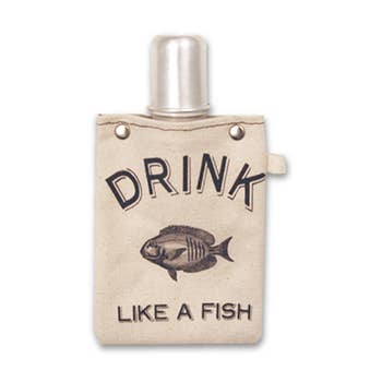 Leather Flask - Jumping Fish Our Leather Wrapped flasks are fun, functional, gift-able, and good looking. We wrap an 8 ounce stainless steel flask (your choice copper coated or matte silver) with a leather sleeve that's hand stitched on the back. The flask has a hinged top attached. The leather is earthy, a perfect match stamped with one of our stock designs or create a custom design.