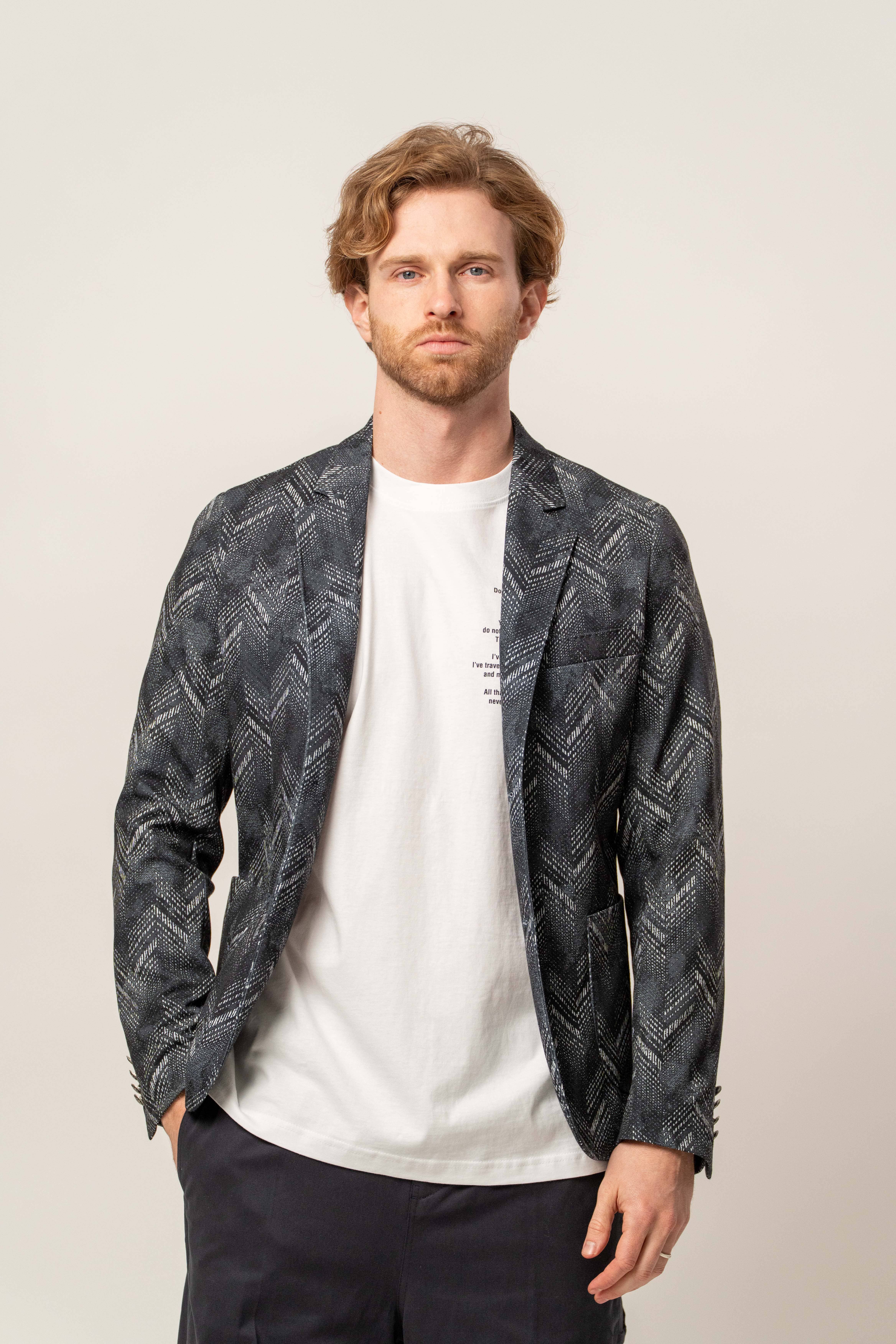 Beatles-style jacket in structured Milano stitch. Featuring a stand collar and clean, minimal design, it combines a tailored silhouette with a modern attitude. Perfect with casual or smart looks. The model wears size 48 ā slim fit.