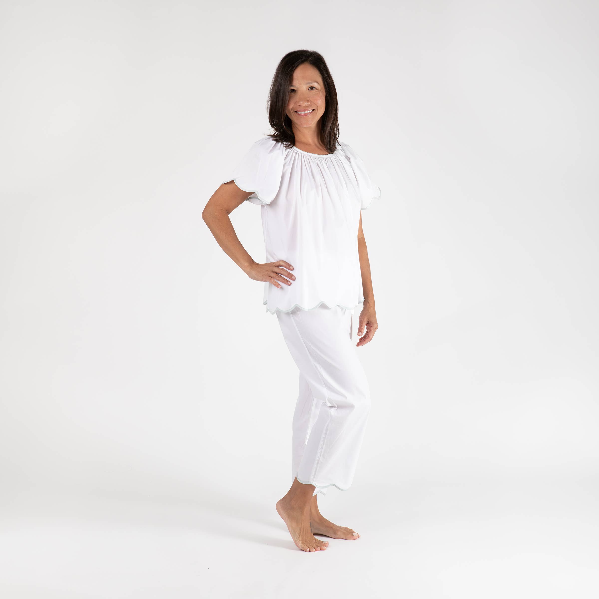 Quilted pique side tie robe with satin scallop collar.