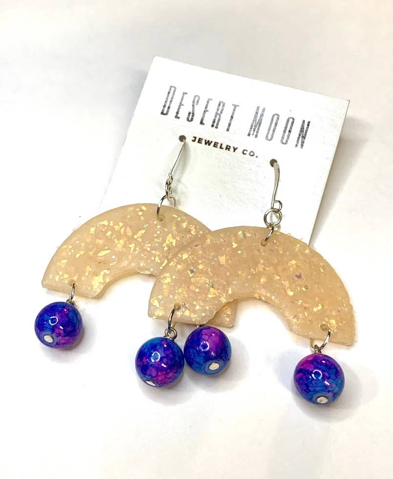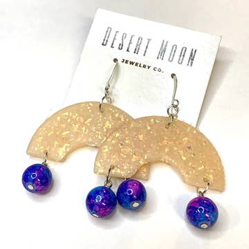 Calling all astrology nerds! A bright yellow sun and a blue marbled moon feature an iridescent star dangle. 🩵 Quality crafted earrings made from bio-plastic (not petroleum!) 🩵 Made with tarnish resistant, nickel safe stainless steel hardware 🩵 Lightweight statement piece 🩵 Easy to display! Comes on a 5" card with hanger hole 🩵 2.25" long Earrings come on 5" branded Peach Beast cards with hanger holes for easy display. All merchandise must remain on branded Peach Beast cards in accordance with Peach Beast and Faire policy.