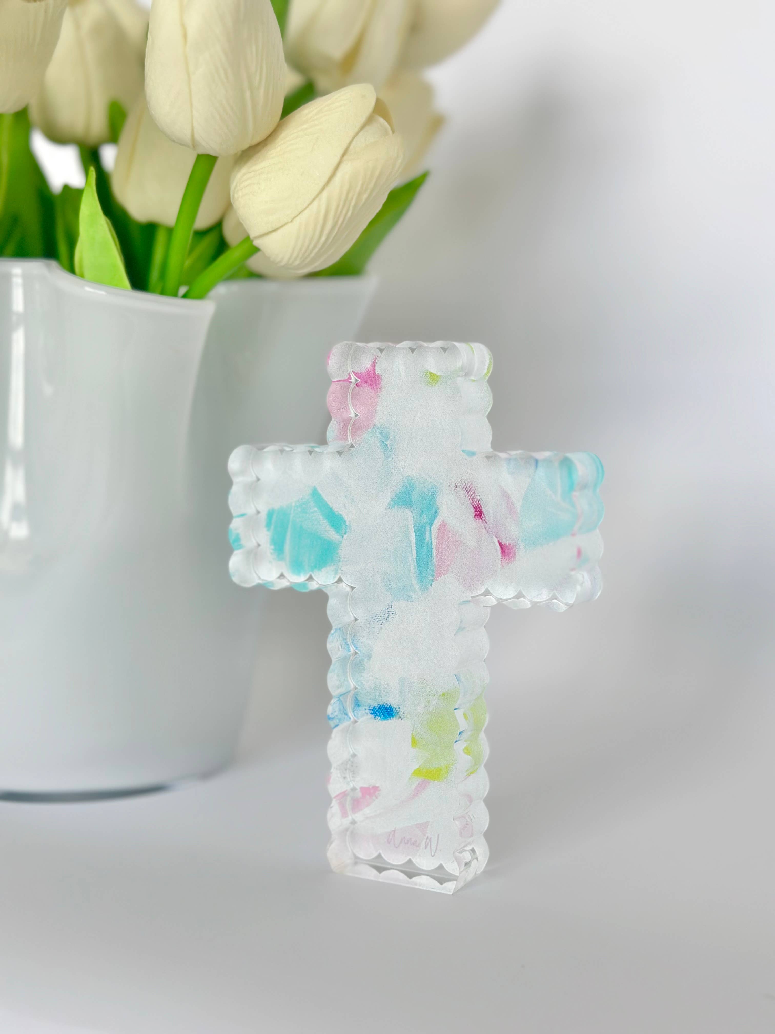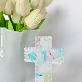 1 3/8 Inches H. Glass pocket cross. 48 items - 8 each of red, blue, green, yellow, purple, and orange.