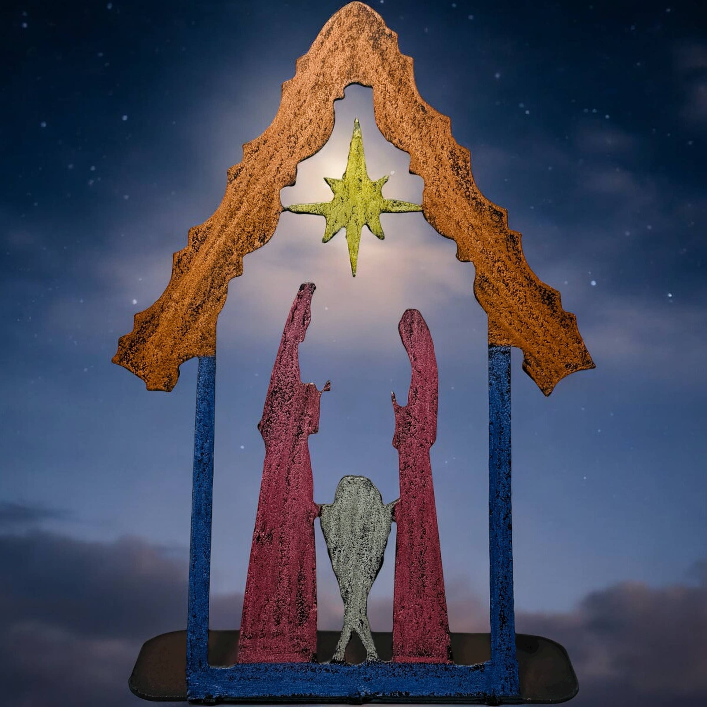 Discover the melodic charm of handmade recycled metal wind chimes, crafted with care by a talented artist right here in the USA. Each chime is a testament to creativity and sustainability, with every piece carefully selected and repurposed to create a harmonious symphony of sound and style. Hung from cords, these wind chimes feature a wonderfully sounding bell, each one a unique treasure reclaimed and transformed. Every element adds its own distinctive timbre to the gentle melody that fills the air. As the breeze caresses the chimes, they come to life, their soothing tones echoing through the landscape and bringing a sense of serenity to any environment. Whether adorning a porch, garden, or window, these wind chimes add a touch of musical magic to every moment. More than just decorative accents, these recycled metal wind chimes are reminders of the beauty that can emerge from sustainability and creativity. Painted assorted colors on one side and rust on the back.