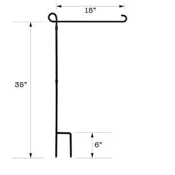 Black metal garden flag pole, topped with a Fleur de Lis ornament, is a sturdy and attractive way to display any 13x18 outdoor flag. Outer end of pole has curved design with included matching washer piece to stop flag from slipping off on a windy day. Two ground stakes at bottom provide extra stability. Pole is one piece; height is 40in.