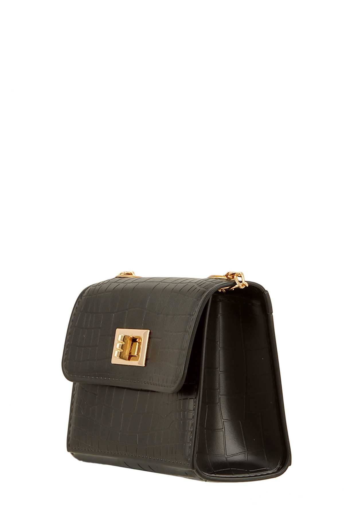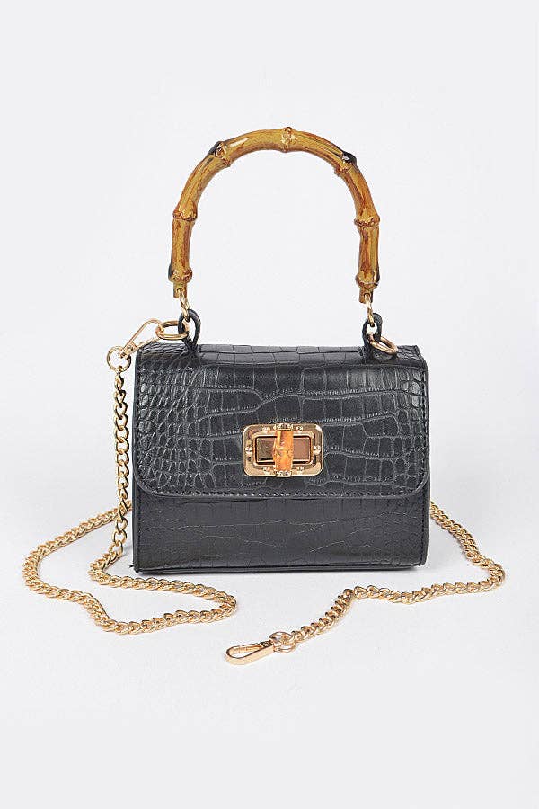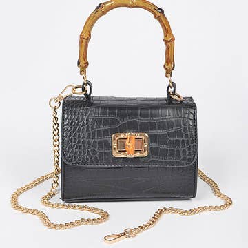 Rowan Black Croc Bag Features: black crocodile embossed genuine leather and black patent leather envelope style structured bag, gold logo piece, black bamboo handle, black tassel, crossbody chain, 1 main compartment, open interior pocket, zippered pocket Dimensions: 10.75 x 7 x 1.5"