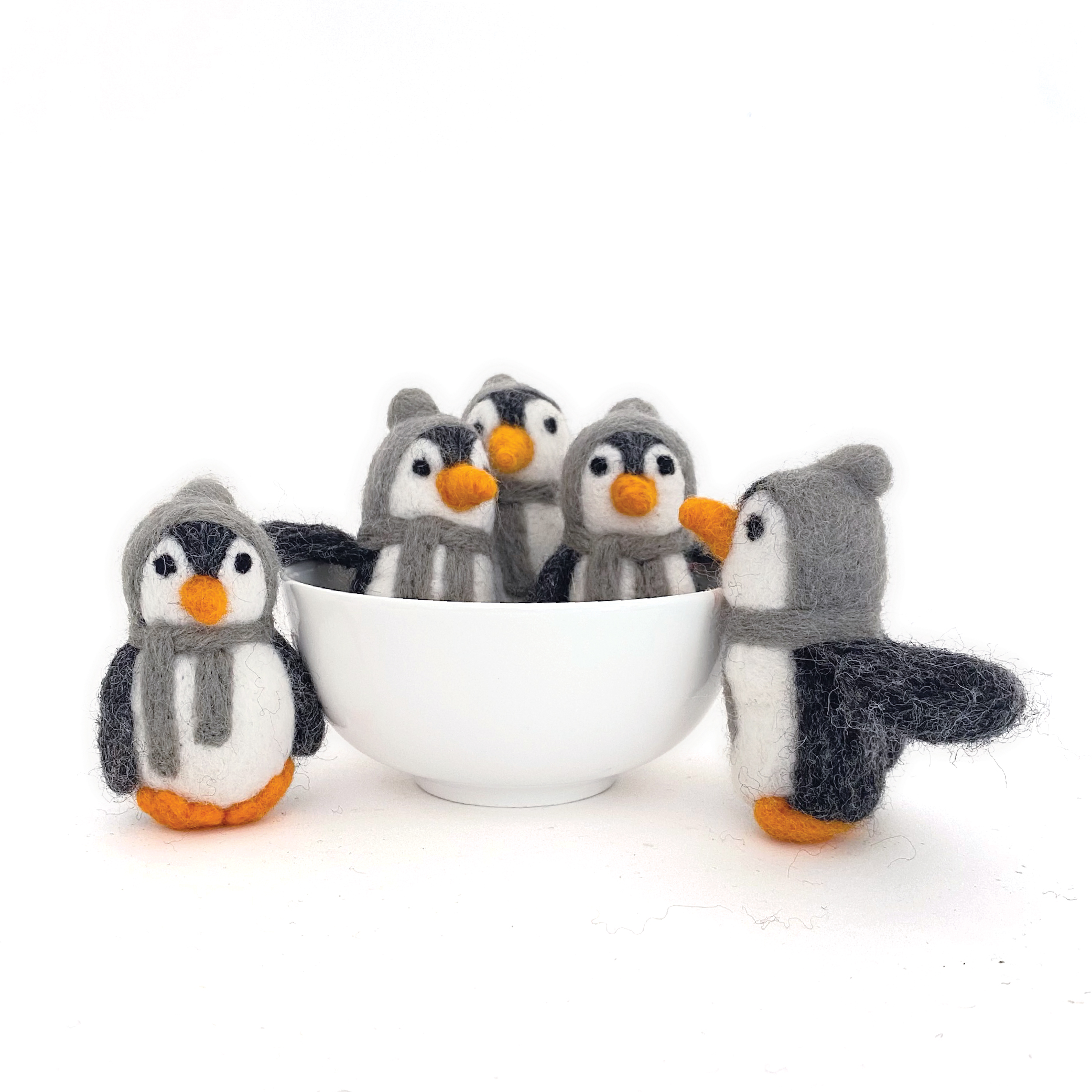 Our felt penguin figures are the perfect addition to your Christmas, winter or holiday decor. Made from 100% New Zealand wool, these figures are handcrafted by fair trade artisans in Nepal and packaged with love in our New Jersey studio. Please note: penguins are sold individually and are designed to stand or be propped up; they do not include a hanger or flat wooden base. — Product Details * Color * Penguins are made from white, black, charcoal and orange felt * Accessories (hat and scarf) are made from red felt * Size * Each penguin is approximately 3.25 inches high x 2.5 inches wide * Due to their handmade nature, the size of felt pieces may vary slightly * Packaging * Perfect for gifting! Each figure or set comes with a reusable keepsake gift box — ©Sheep Farm Felt. All rights reserved.