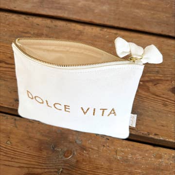 Fall in love with our pretty celadon-colored pouch with its gold glitter Choupinette print. 100% cotton 320 g/m2, fully lined with ecru cotton Gold zipper with a small fabric bow attached to the pull tab. Gold glitter print Dimensions: 16x21 Care instructions: Wash at 30°
