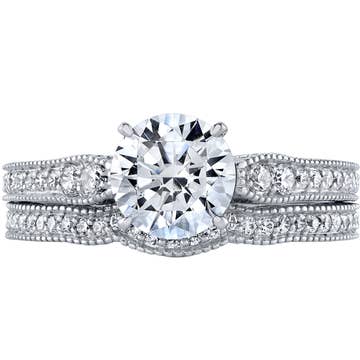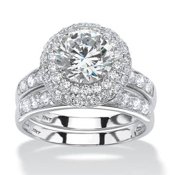 Classic Cathedral Ring Guard and Engagement Ring - 2 Piece Set Includes Guard and 1.5 Ct Moissanite Solitaire - Sterling Silver - Sizes 4 to 10 This bridal set features a 1.5 CT platinum-plated moissanite solitaire and a matching sterling silver ring guard. The ring guard is TB-GUARD-0077-SICZWG-L which is a TwoBirch bestseller. The ring guards feature 52 round brilliant cut cubic zirconia weighing approximately 1.04 carats in total. The engagement ring features a certified 1.5-carat moissanite. The style number is TB-TL-0003-SIMOWG if you wish to search for it on its own. Material - Moissanite, Stone, Silver.