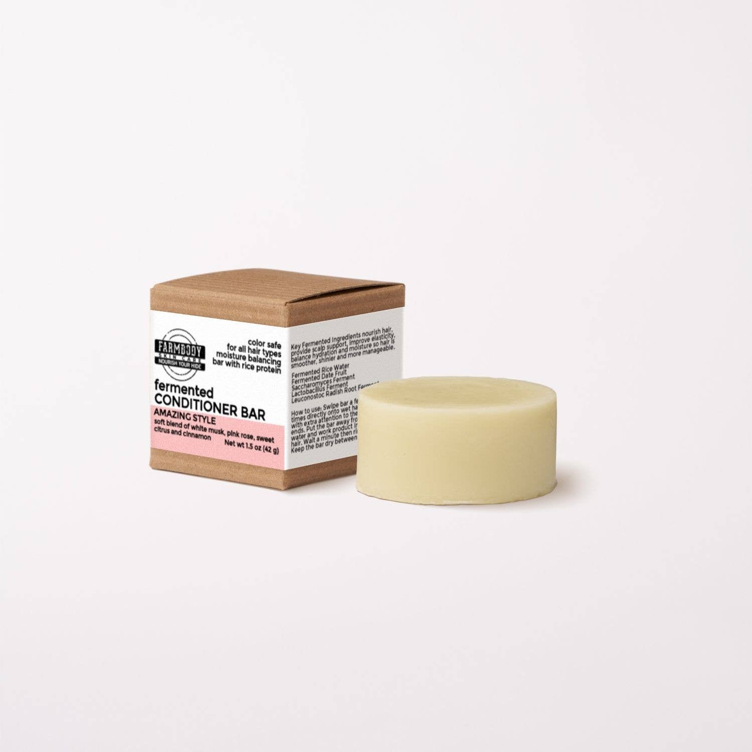 Made in United States Beauty Concerns: Anti-Frizz, Color Protection, Curl Enhancing, Damage Repair, Hydrating, PH Balancing, and Shine Enhancing Formulation Type: Solid / Bar Fragrance Notes: Grapefruit and Orange Ingredient Preferences: Hypoallergenic, Non-Comedogenic, Paraben-Free, Phthalate-Free, and Sulfate-Free Occasion: Christmas and Everyday Scent: Citrus Size: Standard Product Language: English Ingredients: Ingredients: sodium cocoyl isethionate, kokum butter, sodium cocoyl hydrolyzed oat protein,distearoylethyl dimonium chloride*, cetearyl alcohol, cannabis sativa (hemp) seed oil, sodium lactate, oryza sativa (rice) seed water, cetyl alcohol, sambucus nigra fruit extract, glycine betaine (beta vulgaris (beet)) sugar extract, raphanus sativus (radish) seed extract, hydroxypropyltrimonium honey, dl-panthenol, fragrance, saccharomyces ferment, limnanthes alba (meadowfoam) seed oil, triticum vulgare (wheat) seed extract, hordeum distichon (barley) extract, humulus lupulus (hops) extract, yeast extract *biodegradable conditioner Weight: 93.55 g (3.3 oz) Dimensions: 5.1 x 5.1 x 5.1 cm (2 x 2 x 2 in) Product Materials: Plastic-free Packaging: Plastic-free, Recyclable, and Recycled Production: Cruelty-free, Ethically sourced, and Low-impact transport