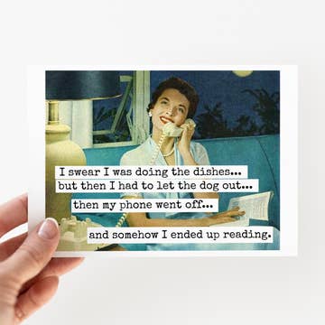 This cheeky card is printed on high quality card stock that makes the ink really pop. It comes display shelf ready, with a fabulous envelope and a clear sheath. The card measures 4.25 x 5.5 inches and is blank inside. We design, print, cut, and package all our cards in-house while our little dog supervises.