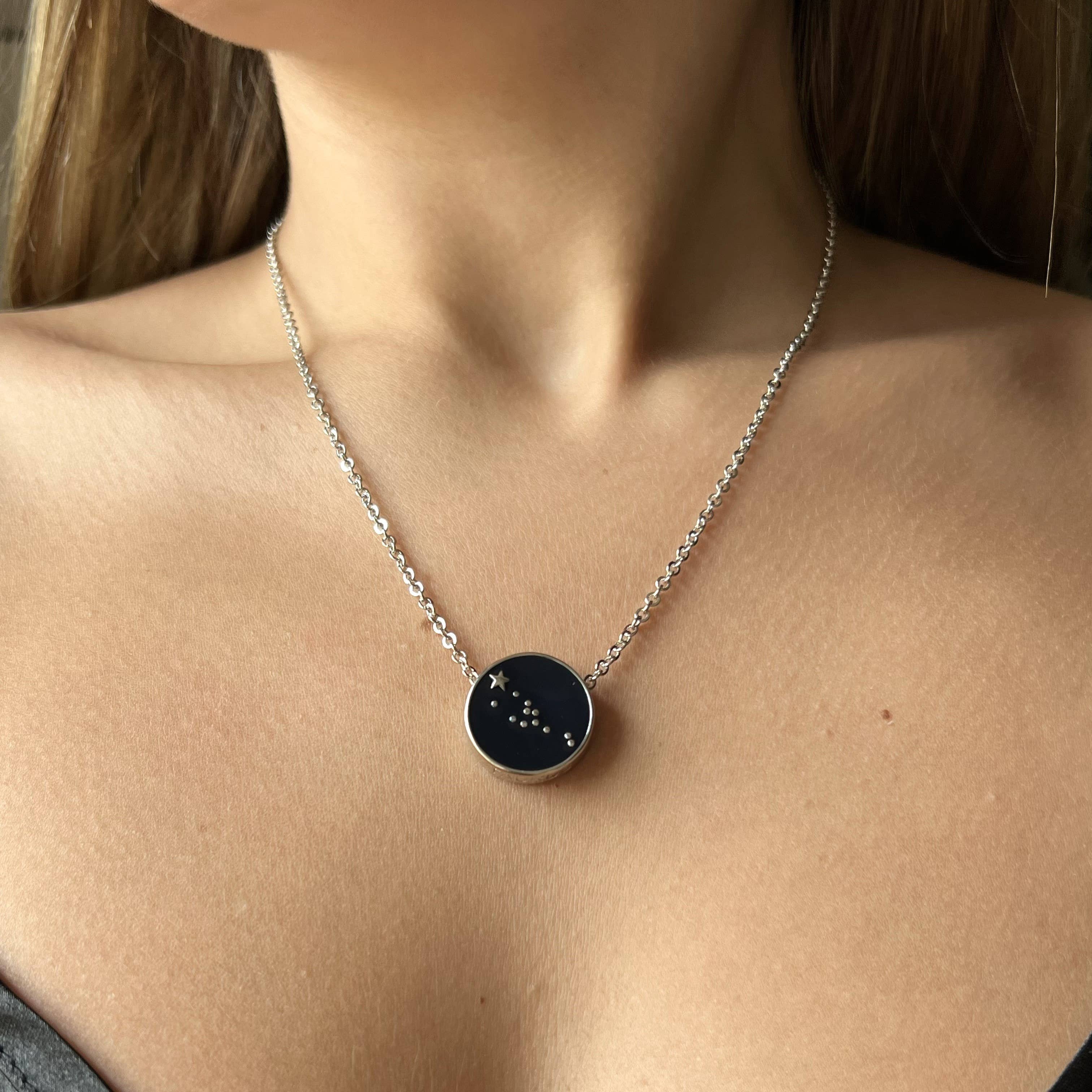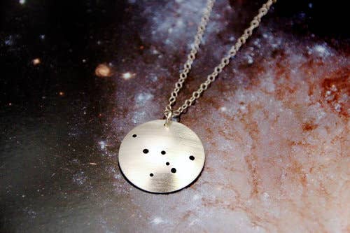 The drilled holes in this handcrafted 3/4" sterling silver circle represents the iconic grouping of stars and nebulas that make up the figure, belt, and sword of Orion. The pendant hangs from an 18" sterling silver chain.