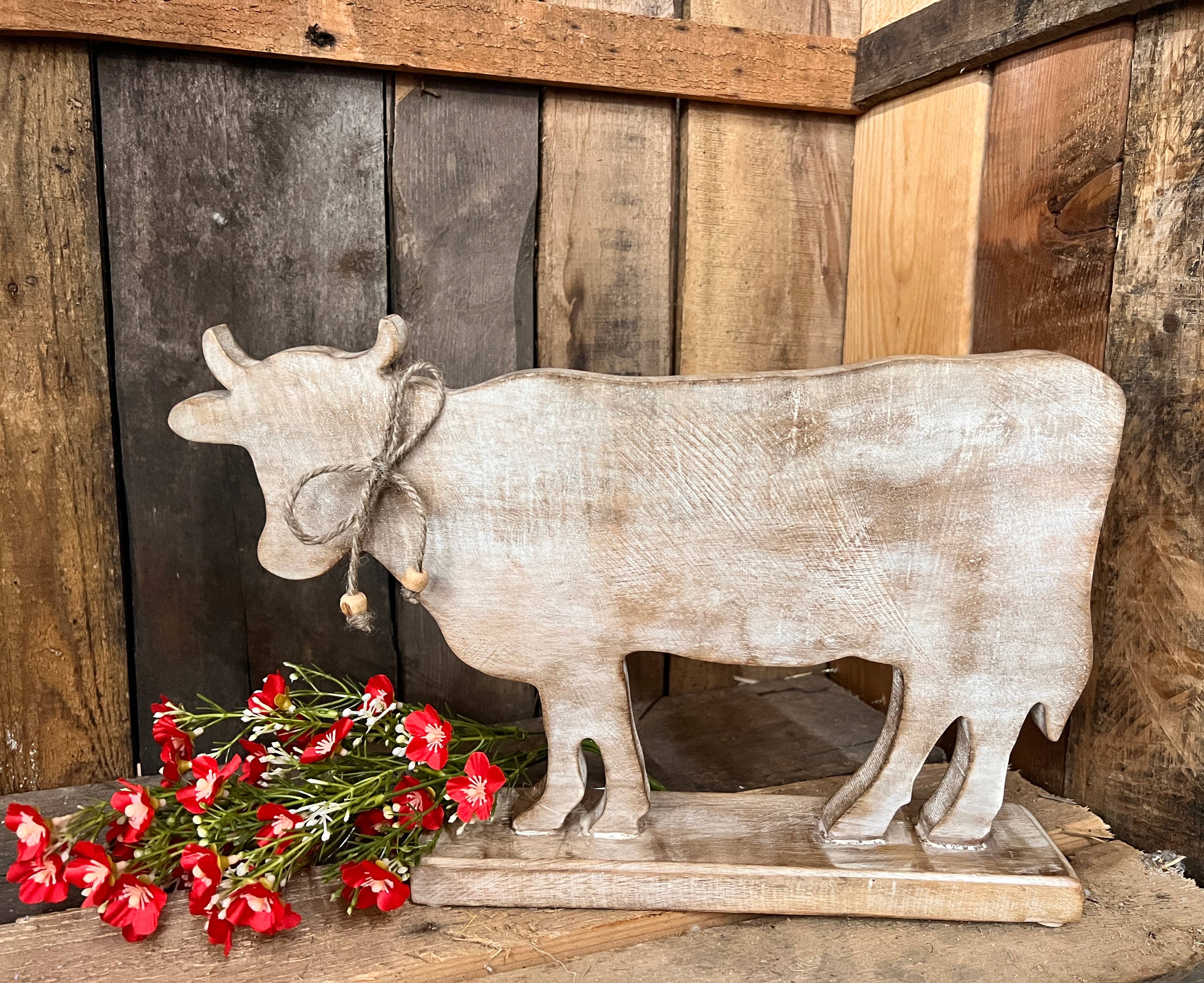 Farm Animal Resin Stack features a cow on the bottom, then a pig, then a sheep and a rooster on top. This resin piece has an overall white finish with a touch of tan accents. 7"H x 4"W.