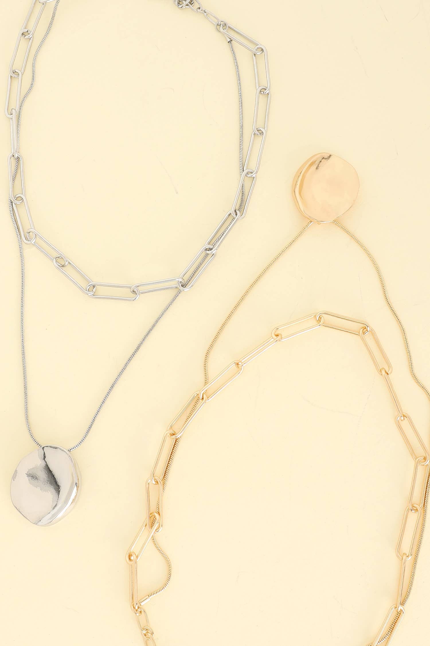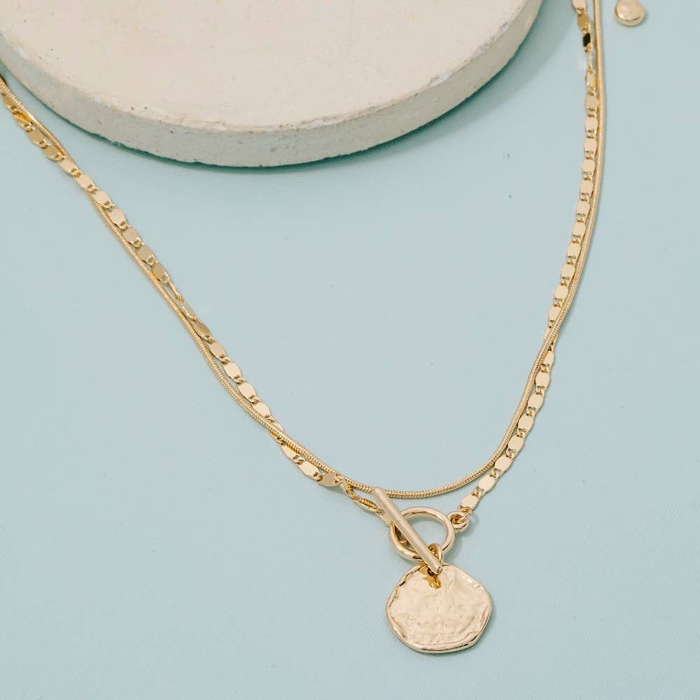 Matte textured discs in gold and silver metal drop from a classic gold chain with front toggle closure. Give a ethical & sustainable gift this holiday season! This necklace makes the perfect gift for Christmas 2025 or stocking stuffers. • Measures 19" including toggle ring closure. • Crafted from a brass metal mix. It is nickel, lead, and cadmium-free. • Handcrafted by women artisans in India.
