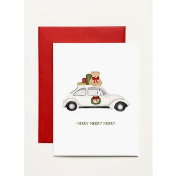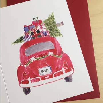 This little car is packed up with the tree and gifts piled atop...perfect for sending a merry, happy greeting. My original watercolor is Professionally printed on super heavy ultra white 120# paper. Size: A2 5 1/2" tall x 4 1/4"" wide. Red envelope. Packaged in a clear cello wrapper. This card is blank on the inside.