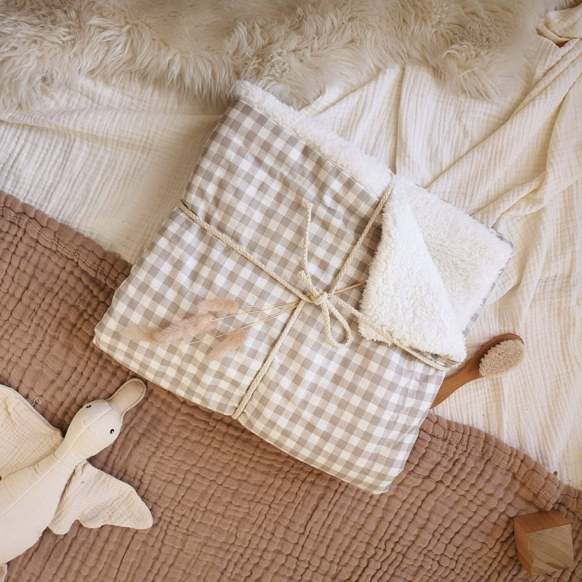 Looking for the Perfect Stuffed Goose for Your Mini? Our adorable Sherpa Goose is the ultimate cuddle companion—super soft, fluffy, and irresistibly huggable. 📏 Dimensions: 45 x 45 cm (18" x 18") Length: 45 cm (from beak to legs) Wingspan: 45 cm (when fully spread) 👶 Perfect for Babies & Toddlers: The flexible, gentle fabric is ideal for little hands, making it a comforting stuffed toy for early years. 🤗 👀 Handcrafted Details: The eyes are carefully embroidered by hand, adding a personal touch to each piece. 🌱 Materials: Body: Sherpa Ivory Beak and Legs : Muslin cotton 🧵 Handmade with Love in our Montreal studio. Each goose is crafted with care to bring joy to your little one! ✨
