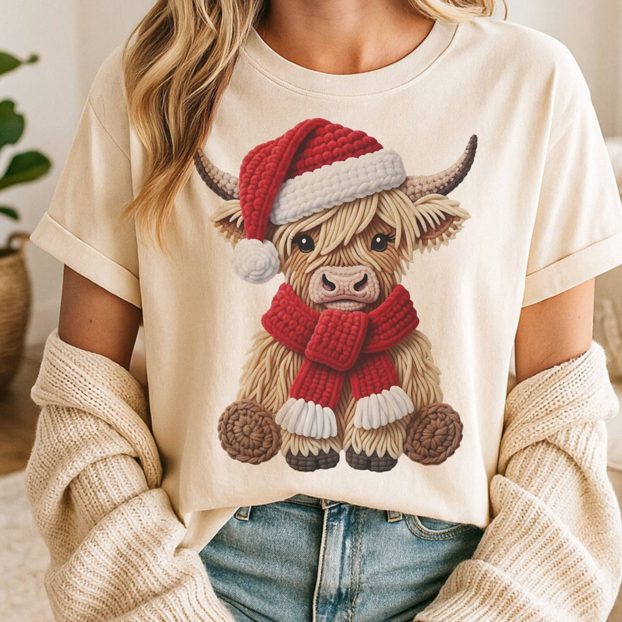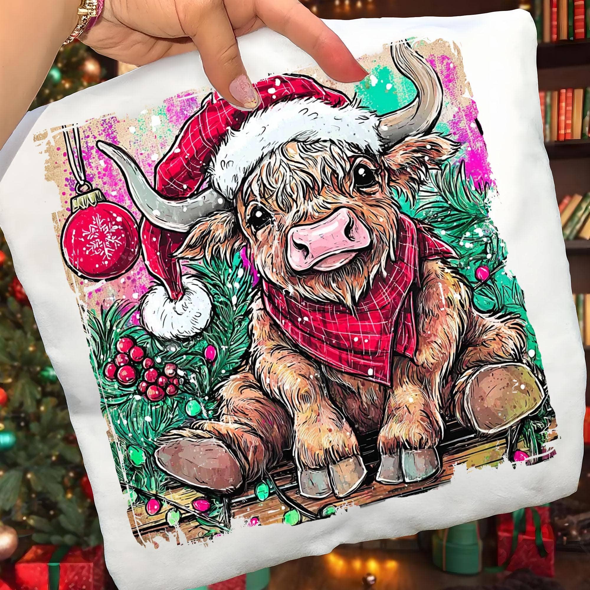Cozy meets country charm with this adorable Christmas Highland Cow design that’s sure to steal hearts all season long. The detailed faux-yarn texture gives the sweet highland cow a handmade, knit-inspired look, complete with a Santa hat and matching red scarf that radiate holiday warmth. This festive favorite captures the spirit of rustic Christmas style with a boutique twist — soft, cheerful, and full of personality. Whether you’re cuddled up by the fire, decorating the tree, or heading to a holiday market, this cozy-cute piece keeps your style merry and unforgettable. Brand: Gildan 18000 Color: Ash This remarkably soft unisex pullover crewneck sweatshirt lends itself to daily wear and year-round layering. Featuring 1x1 ribbed cuffs and waistband, a crew neck, and pill-resistant air jet yarn. Material: 50/50 cotton/polyester blend. The Heavy Blend collection is now made with finer yarns and new MVS Air spinning technology, that improves the fabric by reducing pilling, enhancing dura
