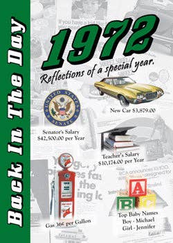 Take a stroll down memory lane as you flip through twenty-four (24) pages of advertisements, news headlines, cost of goods, and other interesting information from your special year. You will see advertisements showing items from your special year including cars, appliances, food products, candy, and other household items. Back In The Day booklets make a great gift or card for Anniversaries, Birthdays, reunions, graduations or any other special event! There is even a short trivia game to play with others or just challenge yourself. With 24 pages of information, Back In The Day Greeting booklets offer a much better value than the traditional folded greeting card.
